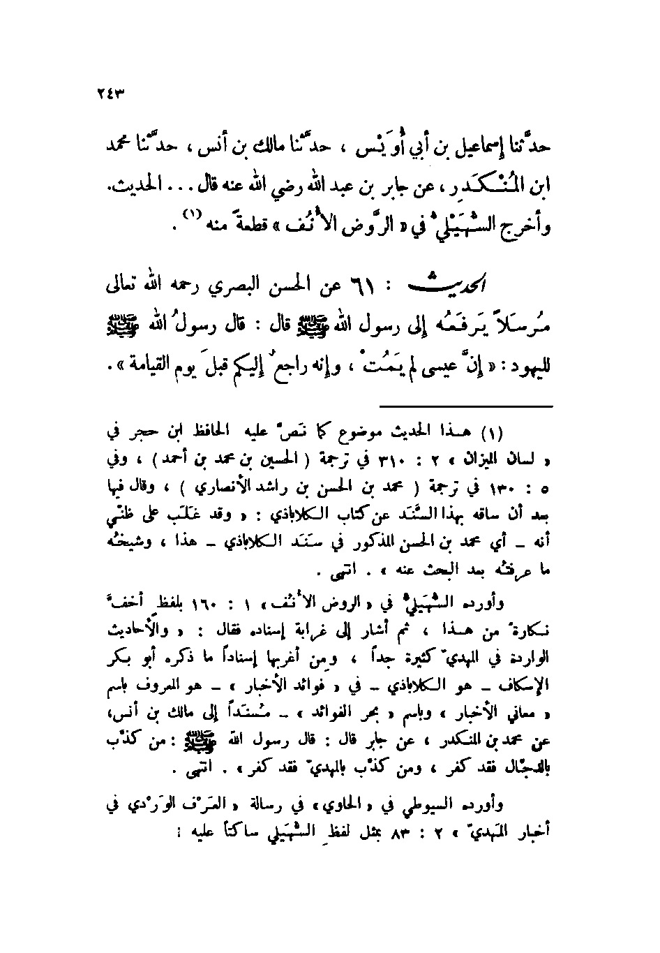 الحديث: 61 عن الحسن البصري رحمه الله تعالى مرسلاً يرفعه إلى رسول الله صلى الله عليه وسلم قال: قال رسول الله صلى الله عليه وسلم لليهود: « ((إن عيسى لم يمت، وإنه راجع إليكم قبل يوم القيامة)) » .