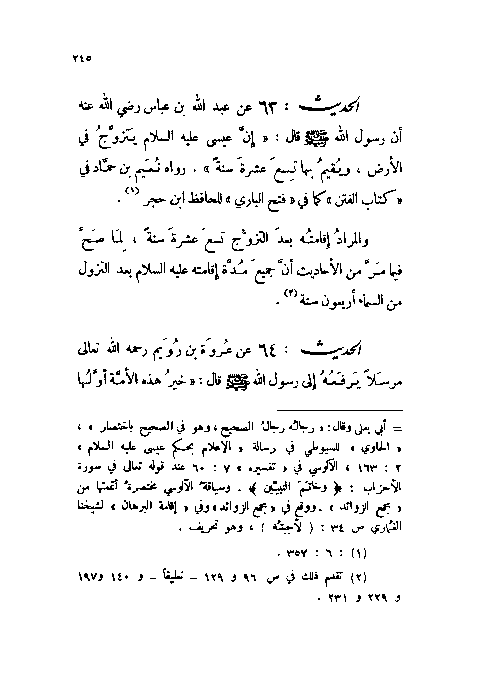 الحديث: 63 عن عبد الله بن عباس رضي الله عنه أن رسول الله صلى الله عليه وسلم قال: « ((إن عيسى عليه السلام يتزوج في الأرض، ويقيم بها تسع عشرة سنة)) » . رواه نعيم بن حماد في ((كتاب الفتن)) كما في ((فتح الباري)) للحافظ ابن حجر.