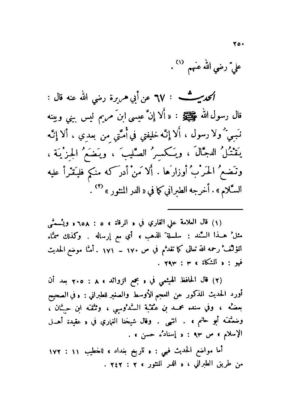 الحديث: 67 عن أبي هريرة رضي الله عنه قال: قال رسول الله صلى الله عليه وسلم: « ((ألا إن عيسى ابن مريم ليس بيني وبينه نبي ولا رسول، ألا إنه خليفتي في أمتي من بعدي، ألا إنه يقتل الرجال، ويكسر الصليب، ويضع الجزية، وتضع الحرب أوزارها. ألا من أدركه منكم فليقرأ عليه السلام)) » . أخرجه الطبراني كما في ((الدر المنثور)) .