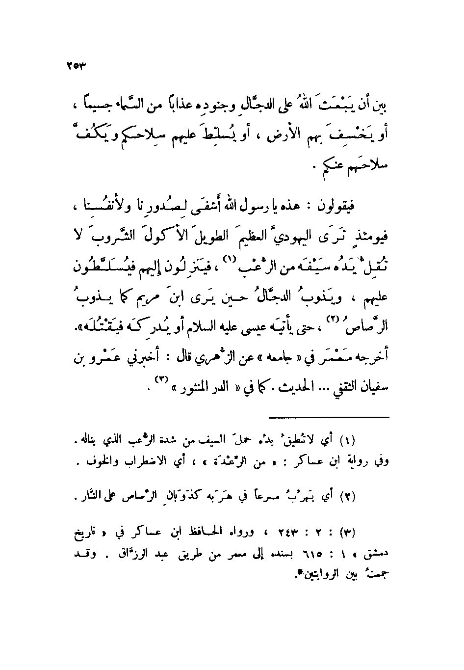 «بين أن يبعث الله على الدجال وجنوده عذاباً من السماء جسيماً، أو يخسف بهم الأرض، أو يسلط عليهم سلاحكم ويكف سلاحهم عنكم.