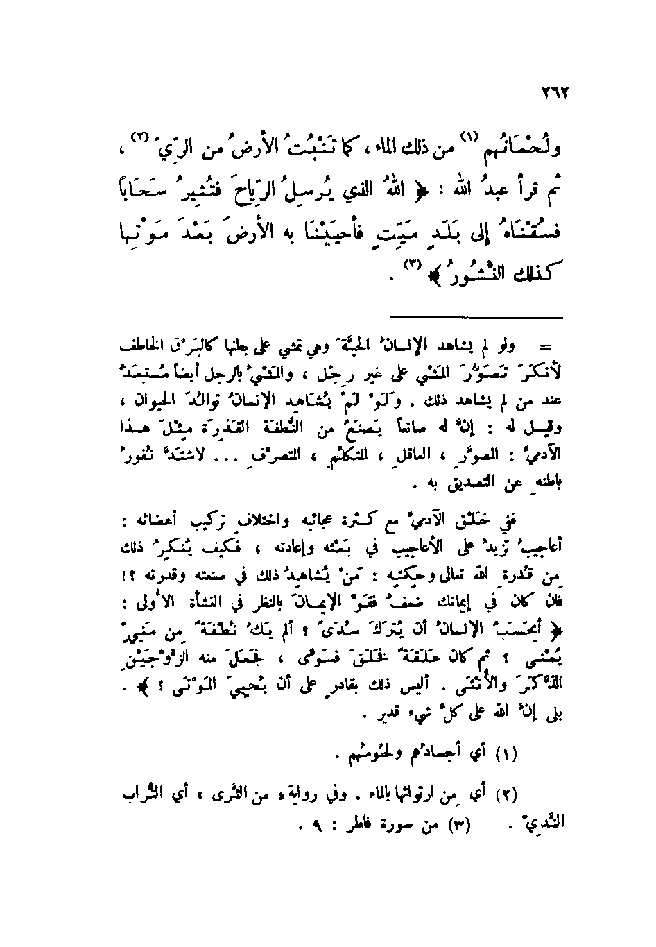ولحمانهم من ذلك الماء، كما تنبت الأرض من الري، ثم قرأ عبد الله: {وَاللَّهُ الَّذِي أَرْسَلَ الرِّيَاحَ فَتُثِيرُ سَحَابًا فَسُقْنَاهُ إِلَى بَلَدٍ مَيِّتٍ فَأَحْيَيْنَا بِهِ الْأَرْضَ بَعْدَ مَوْتِهَا كَذَلِكَ النُّشُورُ} .