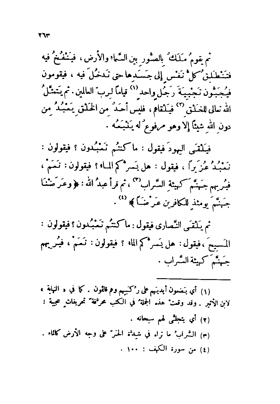 ثم يلقى النصارى فيقول: ما كنتم تعبدون؟ فيقولون: المسيح، فيقول: هل يسركم الماء؟ فيقولون: نعم، فيريهم جهنم كهيئة السراب.