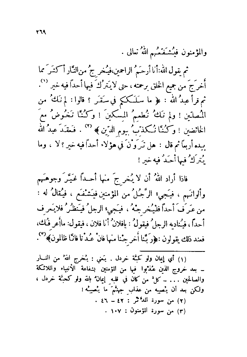ثم يقول الله: أنا أرحم الراحمين، فيخرج من النار أكثر مما أخرج من جميع الخلق برحمته، حتى لا يترك فيها أحداً فيه خير. ثم قرأ عبد الله: {مَا سَلَكَكُمْ فِي سَقَرَ قَالُوا لَمْ نَكُ مِنَ الْمُصَلِّينَ وَلَمْ نَكُ نُطْعِمُ الْمِسْكِينَ وَكُنَّا نَخُوضُ مَعَ الْخَائِضِينَ وَكُنَّا نُكَذِّبُ بِيَوْمِ الدِّينِ} . فعقد عبد الله بيده أربعاً ثم قال: هل ترون في هؤلاء أحداً فيه خير؟ لا، وما يترك فيها أحد فيه خير! .