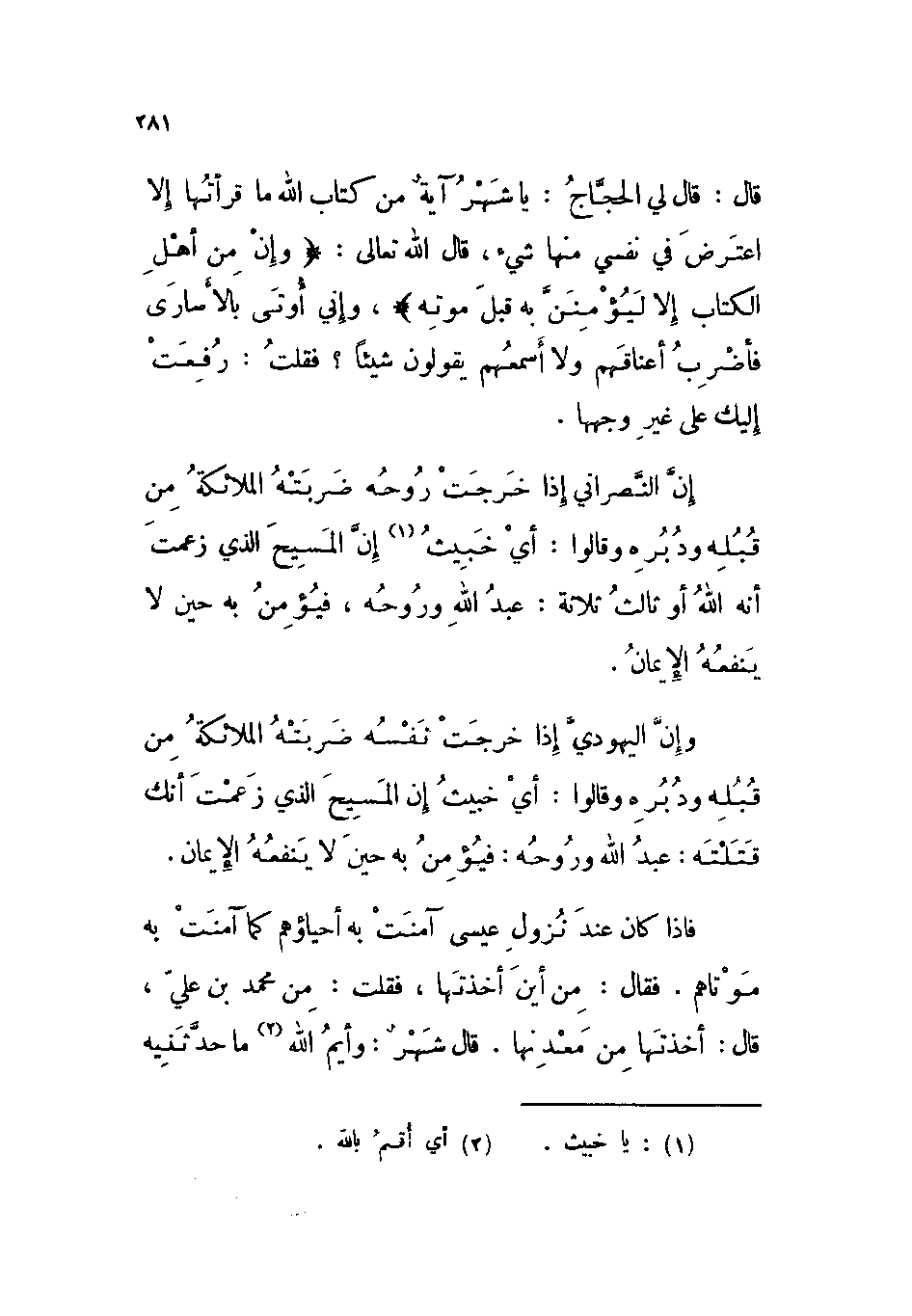 قال: قال لي الحجاج: يا شهرُ آيةٌ من كتاب الله ما قرأتها إلا اعترض في نفسي منها شيء، قال الله تعالى: {وإن من أهل الكتاب إلا ليؤمنن به قبل موته} ، وإني أوتى بالأسارى فأضرب أعناقهم ولا أسمعهم يقولون شيئاً؟ فقلت: رُفعت إليك على غير وجهها.