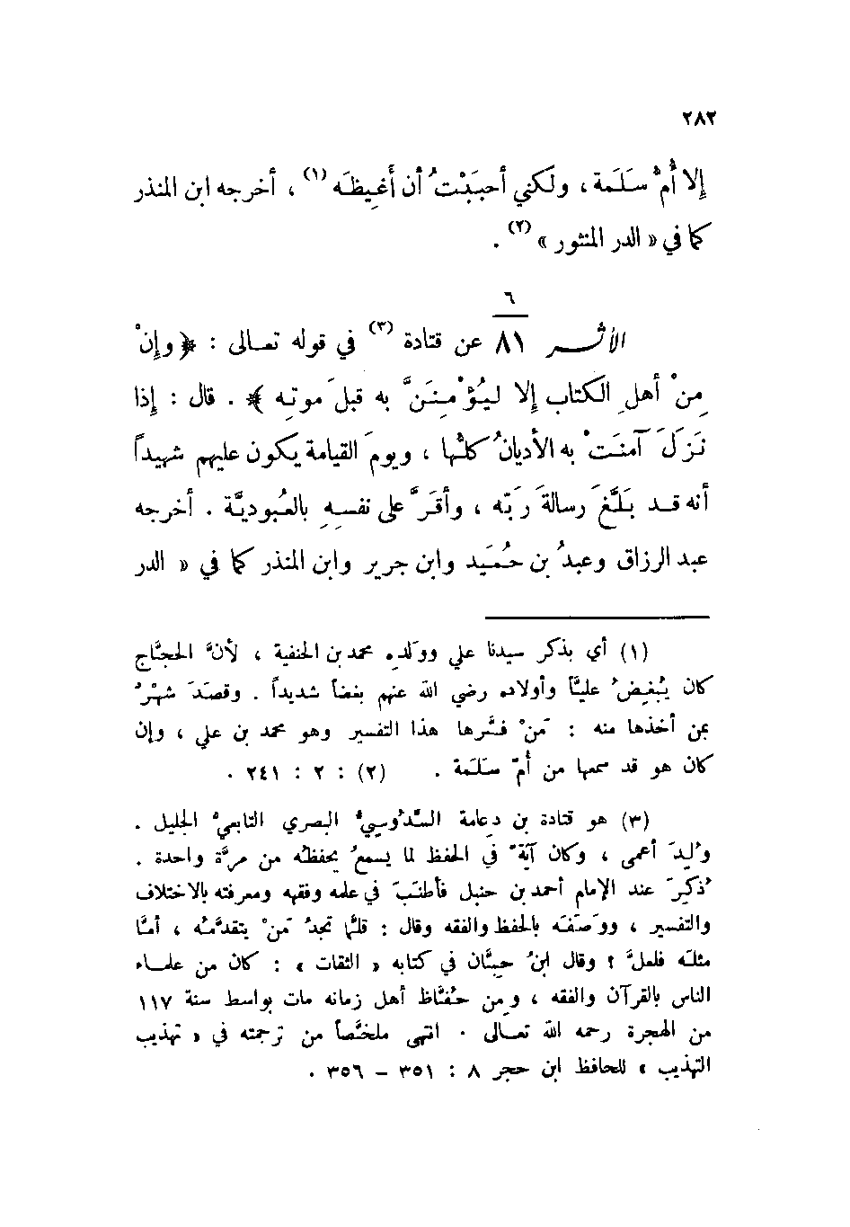 الأثر: 6 \ 81 عن قتادة في قوله تعالى: {وإن من أهل الكتاب إلا ليؤمنن به قبل موته} .