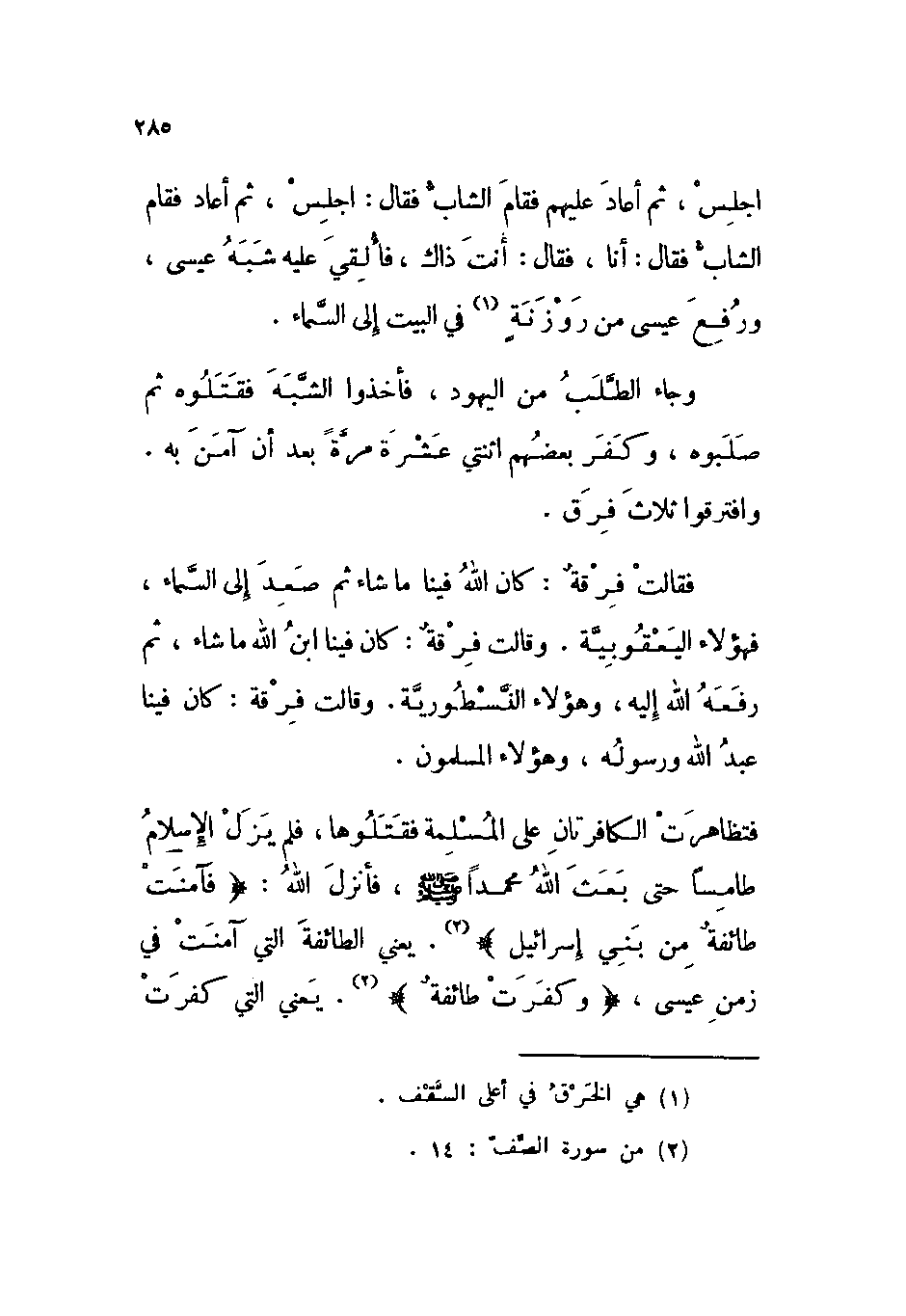 فقالت فرقة: كان الله فينا ما شاء ثم صعد إلى السماء، فهؤلاء اليعقوبية. وقالت فرقة: كان فينا ابن الله ما شاء، ثم رفعه الله إليه، وهؤلاء النسطورية. وقالت فرقة: كان فينا عبد الله ورسوله، وهؤلاء المسلمون.