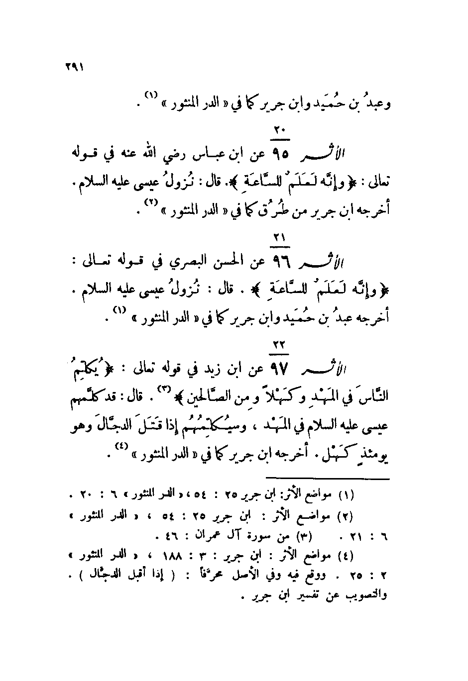 الأثر: 20 \ 95 عن ابن عباس رضي الله عنه في قوله تعالى: {وَإِنَّهُ لَعِلْمٌ لِلسَّاعَةِ} . قال: نزول عيسى عليه السلام. أخرجه ابن جرير من طرق، كما في ((الدر المنثور)) .