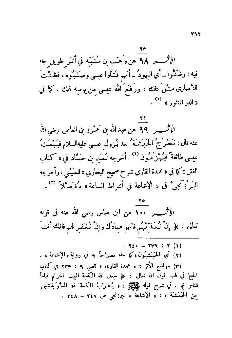 الأثر: 24 \ 99 عن عبد الله بن عمرو بن العاص رضي الله عنه قال: تخرج الحبشة بعد نزول عيسى عليه السلام، فيبعث عيسى طائفة فيهزمون. أخرجه نعيم بن حماد في ((كتاب الفتن)) كما في ((عمدة القاري شرح صحيح البخاري)) للعيني، وأخرجه البرزنجي في ((الإشاعة في أشراط الساعة)) مفصلاً.