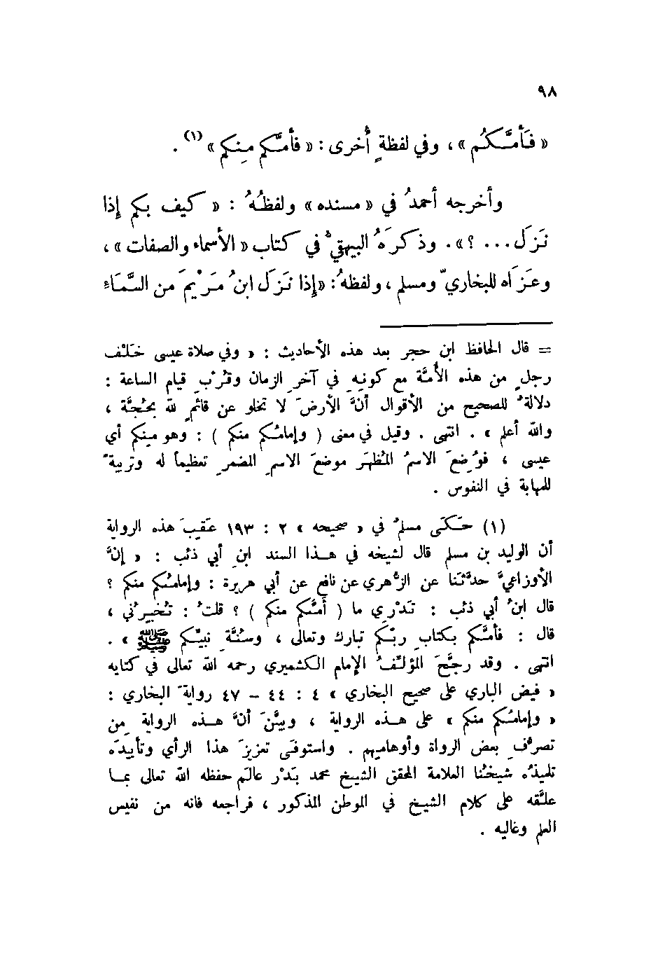 وأخرجه أحمد في ((مسنده)) ولفظه: « ((كيف بكم إذا نزل ... ؟)) » . وذكره البيهقي في كتاب ((الأسماء والصفات)) ، وعزاه للبخاري ومسلم، ولفظه: « ((إذا نزل ابن مريم من السماء»