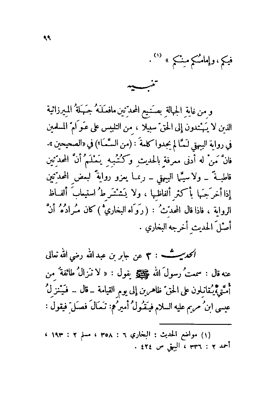 الحديث: 3 عن جابر بن عبد الله رضي الله تعالى عنه قال: سمعت رسول الله صلى الله عليه وسلم يقول: « ((لا تزال طائفة من أمتي يقاتلون على الحق ظاهرين إلى يوم القيامة - قال - فينزل عيسى ابن مريم عليه السلام فيقول أميرهم: تعال فصل، فيقول:»