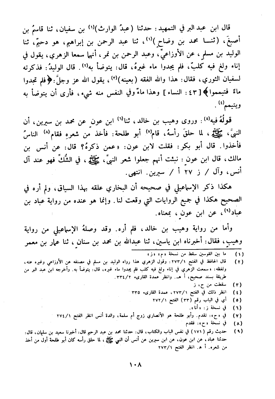 قَوْله فِيهِ وَرَوَى وُهَيْبُ بْنُ خَالِدٍ ثَنَا ابْنُ عَوْنٍ عَنْ مُحَمَّدِ بْنِ سِيرِينَ أَن النَّبِي صلى الله عَلَيْهِ وَسَلَّمَ لَمَّا حَلَقَ رَأْسَهُ قَامَ أَبُو طَلْحَةَ فَأَخَذَ مِنْ شَعْرِهِ فَقَامَ النَّاسُ فَأَخَذُوا قَالَ أَبُو بَكْرٍ فَقُلْتُ لابْنِ عَوْنٍ ((عَمَّنْ ذَكَرَهُ قَالَ عَنْ أَنَسِ بْنِ مَالِكٍ قَالَ ابْنُ عَوْنٍ نُبِّئْتُ أَنَّهُمْ جَعَلُوا شَعْرَ النَّبِيِّ صَلَّى اللَّهُ عَلَيْهِ وَسَلَّمَ فِي الشَّكِّ فَهُوَ عِنْدَ آلِ أَنَسٍ وَآلِ ز 27 أسِيرِينَ انْتَهَى