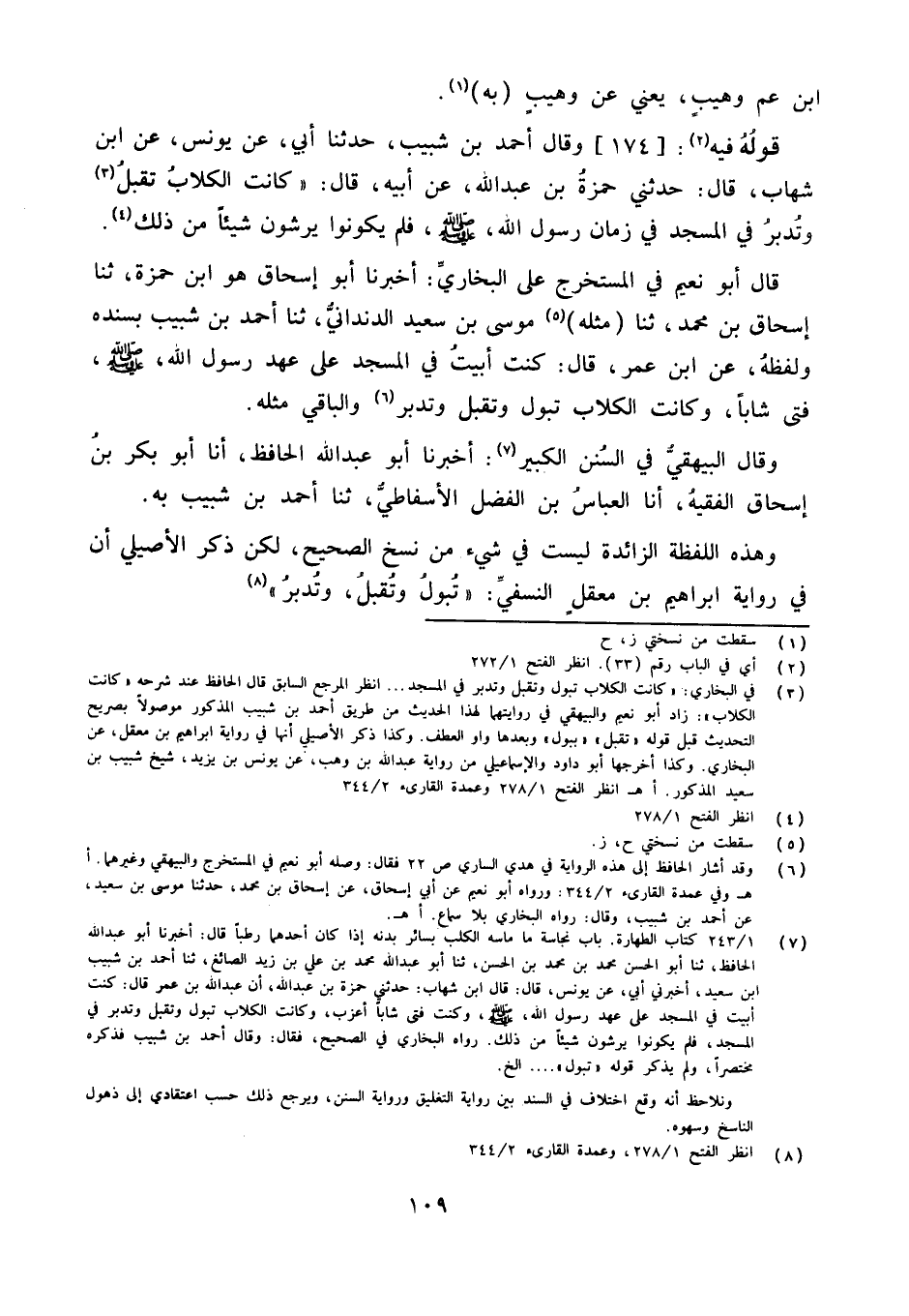 قَوْله فِيهِ [174] وَقَالَ أَحَمْدُ بْنُ شَبِيبٍ حَدَّثنا أَبِي عَنْ يُونُسَ عَنِ ابْنِ شِهَابٍ قَالَ حَدَّثَني حَمْزَةُ بْنُ عَبْدِ اللَّهِ عَنْ أَبِيهِ قَالَ ((كَانَتِ الْكِلابُ تُقْبِلُ وَتُدْبِرُ فِي الْمَسْجِدِ فِي زَمَانِ رَسُولِ اللَّهِ صَلَّى اللَّهُ عَلَيْهِ وَسَلَّمَ فَلَمْ يَكُونُوا يَرُشُّونَ شَيْئًا مِنْ ذَلِكَ