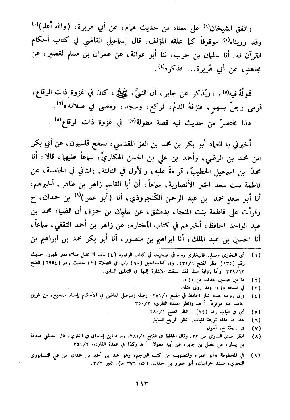 أَخْبَرَنِي بِهِ الْعِمَادُ أَبُو بَكْرِ بْنُ مُحَمَّدِ بْنِ الْعِزِّ الْمَقْدِسِيُّ بِسَفْحِ قَاسِيُونَ عَنْ أَبِي بكر ابْن مُحَمَّدِ بْنِ الرَّضِيِّ وَأَحْمَدَ بْنِ عَلِيِّ بْنِ الْحَسَنِ الْهَكَّارِيِّ سَمَاعًا عَلَيْهِمَا قَالا أَنا مُحَمَّدُ بْنُ إِسْمَاعِيلَ الْخَطِيبُ قِرَاءَةً عَلَيْهِ وَالأَوَّلُ فِي الثَّالِثَةِ وَالثَّانِي فِي الْخَامِسَةِ عَنْ فَاطِمَةَ بِنْتِ سَعْدِ الْخَيْرِ الأَنْصَارِيَّةِ سَمَاعًا أَنَّ أَبَا الْقَاسِمِ زَاهِرَ بْنَ طَاهِرٍ أَخْبَرَهُمْ أَنا أَبُو سعد مُحَمَّد بن عبد الرَّحْمَن الكنجروذي أَنا (أَبُو عمر) بْنُ حَمْدَانَ ح وَقرأت عَلَى فَاطِمَةَ بِنْتِ الْمُنَجَّا بِدِمَشْقَ عَنْ سُلَيْمَان بن حَمْزَة أَن الضياء مُحَمَّدَ بْنَ عَبْدِ الْوَاحِدِ الْحَافِظَ أَخْبَرَهُمْ فِي كِتَابِ الْمُخْتَارَةِ عَنْ زَاهِرِ بْنِ أَحْمَدَ الثَّقَفِيِّ سَمَاعًا أَنا الْحُسَيْنُ بْنُ عَبْدِ الْمَلِكِ أَنا إِبْرَاهِيمُ بْنُ مَنْصُورٍ أَنا أَبُو بَكْرٍ مُحَمَّدُ بْنُ إِبْرَاهِيمَ بن