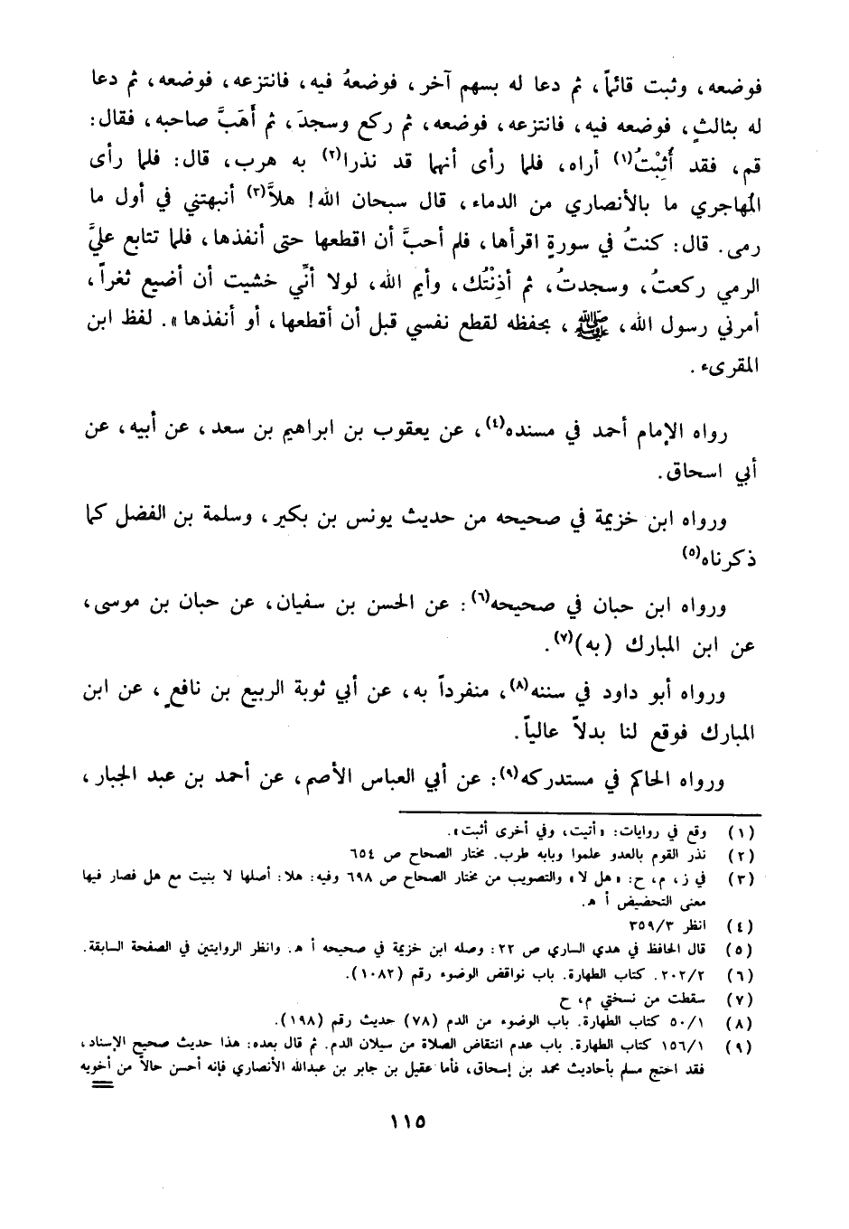 فَوَضَعَهُ وَثَبَتَ قَائِمًا ثُمَّ دَعَا لَهُ بِسَهْمٍ آخَرَ فَوَضَعَهُ فِيهِ فَانْتَزَعَهُ فَوَضَعَهُ ثُمَّ دَعَا لَهُ بِثَالِثٍ فَوَضَعَهُ فِيهِ فَانْتَزَعَهُ فَوَضَعَهُ ثُمَّ رَكَعَ وَسَجَدَ ثُمَّ أَهَبَّ صَاحِبَهُ فَقَالَ قُمْ فَقَدْ أُثِبْتُ أَرَاهُ فَلَمَّا رَأَى أَنَّهُمَا قَدْ نَذَرَا بِهِ هَرَبَ قَالَ فَلَمَّا رَأَى الْمُهَاجِرِيُّ مَا بِالأَنْصَارِيِّ مِنَ الدِّمَاءِ قَالَ سُبْحَانَ اللَّهِ هَلا أَنْبَهْتَنِي فِي أَوَّلِ مَا رَمَى قَالَ كنت فِي سُورَة اقرأها فَلَمْ أُحِبَّ أَنْ أَقْطَعَهَا حَتَّى أُنْفِذَهَا فَلَمَّا تَتَابَعَ عَلَيَّ الرَّمْيُ رَكَعْتُ وَسَجَدْتُ ثُمَّ أَذِنْتُكَ وَايْمُ اللَّهِ لَوْلا أَنِّي خَشِيتُ أَنْ أُضَيِّعَ ثَغْرًا أَمَرَنِي رَسُولُ اللَّهِ صَلَّى اللَّهُ عَلَيْهِ وَسَلَّمَ بِحِفْظِهِ لَقَطَعَ نَفَسِي قَبْلَ أَنْ أَقْطَعَهَا أَوْ أُنْفِذَهَا)) لفظ ابْن الْمُقْرِئ