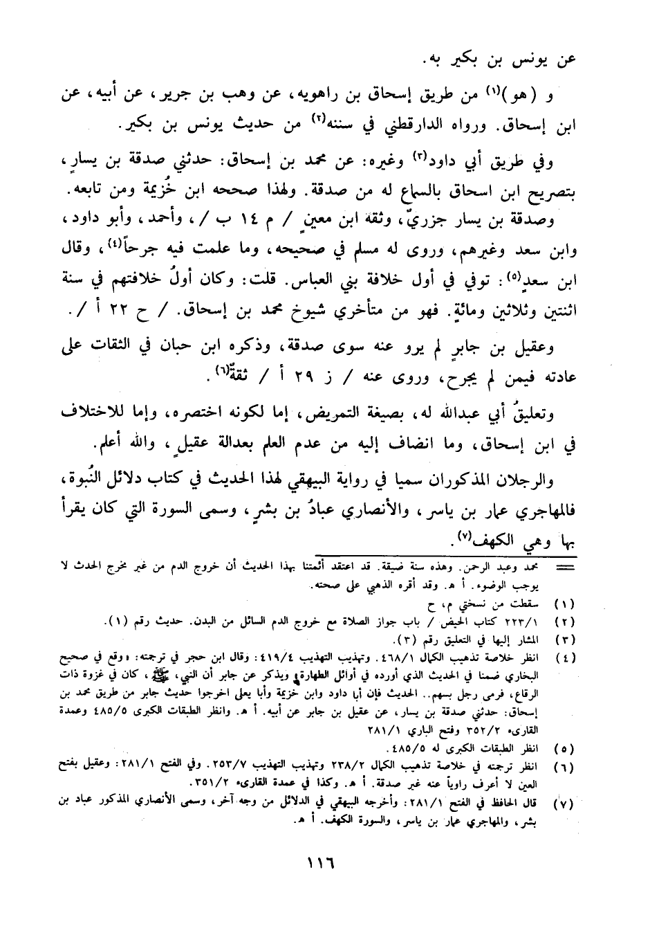 وَصدقَة بن يسَار جزري وثقة ابْن معِين م 13 ب وَأحمد وَأَبُو دَاوُد وَابْن سعد وَغَيرهم وروى لَهُ مُسلم فِي صَحِيحه وَمَا علمت فِيهِ جرحا وَقَالَ ابْن سعد توفّي فِي أول خلَافَة بني الْعَبَّاس قلت وَكَانَ أول خلافتهم فِي سنة اثْنَتَيْنِ وَثَلَاثِينَ وَمِائَة فَهُوَ من متأخري شُيُوخ مُحَمَّد بن إِسْحَاق ح 22 أ
