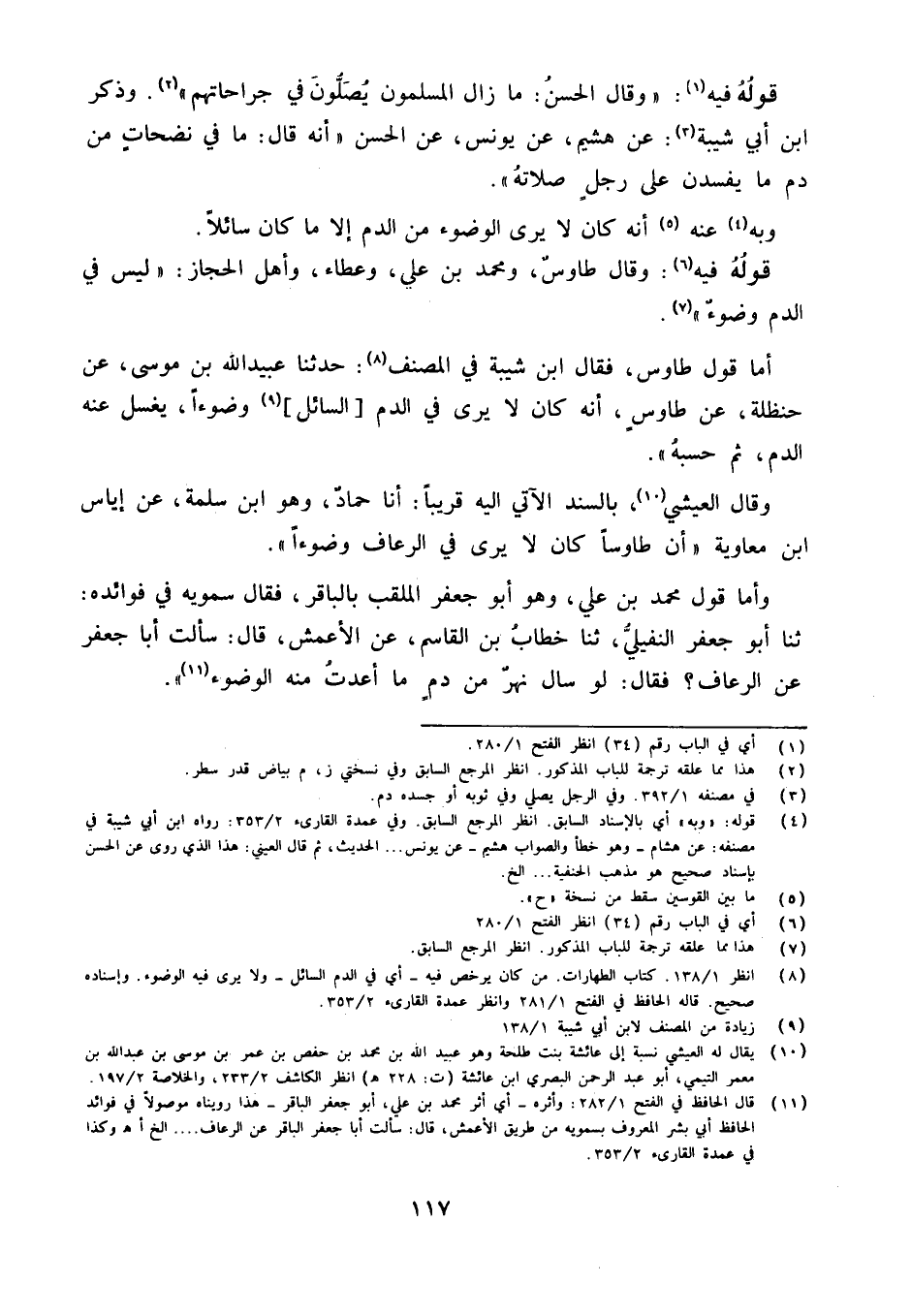 وَأما قَول مُحَمَّد بن عَليّ وَهُوَ أَبُو جَعْفَر الملقب بالباقر فَقَالَ سمويه فِي فَوَائده ثَنَا أَبُو جَعْفَر النُّفَيْلِي ثَنَا خطاب بن الْقَاسِم عَن الْأَعْمَش قَالَ سَأَلت أَبَا جَعْفَر عَن الرعاف فَقَالَ لَو سَالَ نهر من دم مَا أعدت مِنْهُ الْوضُوء))