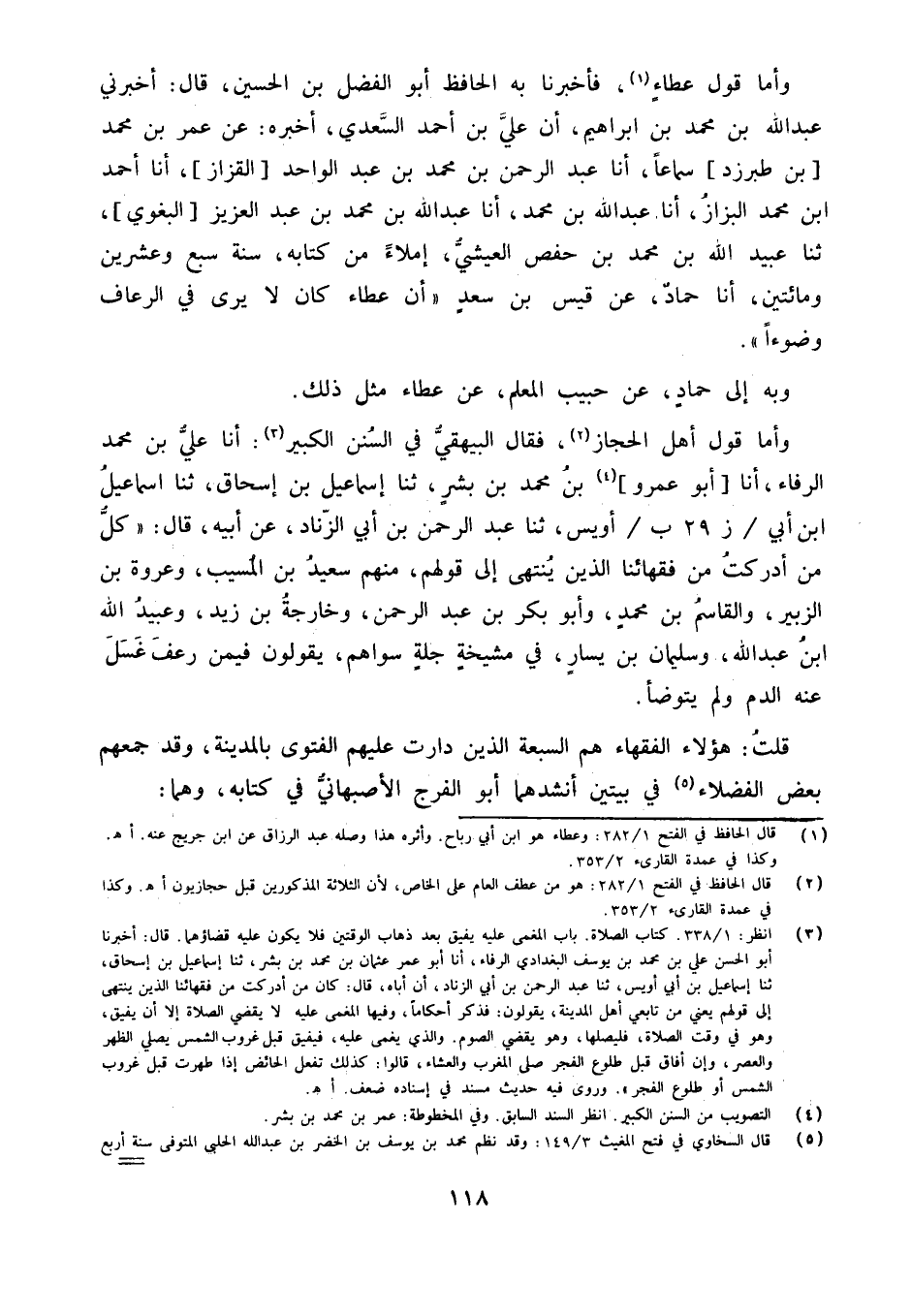 وَأما قَول أهل الْحجاز فَقَالَ الْبَيْهَقِيّ فِي السّنَن الْكَبِير أَنا عَليّ بن مُحَمَّد الرفاء أَنا [أَبُو عَمْرو] بن مُحَمَّد بن بشر ثَنَا إِسْمَاعِيل بن إِسْحَاق ثَنَا إِسْمَاعِيل ابْن أبي ز 29 ب أويس ثَنَا عبد الرَّحْمَن بن أبي الزِّنَاد عَن أَبِيه قَالَ ((كل من أدْركْت من فقهائنا الَّذين ينتهى إِلَى قَوْلهم مِنْهُم سعيد بن الْمسيب وَعُرْوَة بن الزبير وَالقَاسِم بن مُحَمَّد وَأَبُو بكر بن عبد الرَّحْمَن وخارجة بن زيد وَعبيد الله ابْن عبد الله وَسليمَان بن يسَار فِي مشيخة جلة سواهُم يَقُولُونَ فِيمَن رعف غسل عَنهُ الدَّم وَلَو يتَوَضَّأ
