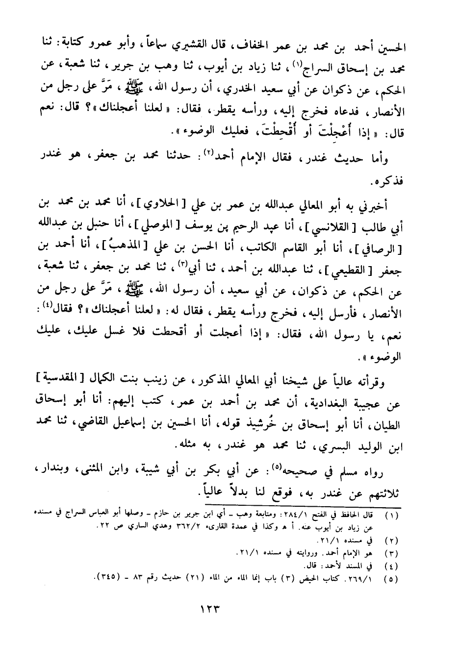 أَخْبَرَنِي بِهِ أَبُو الْمَعَالِي عَبْدُ اللَّهِ بْنُ عُمَرَ بْنِ عَلِيٍّ [الْحَلاوِيُّ] أَنا مُحَمَّد بن مُحَمَّد بن أبي طَالِبٍ [الْقَلانِسِيُّ] أَنا عَبْدُ الرَّحِيمِ بْنُ يُوسُفَ [الْمَوْصِلِيُّ] أَنا حَنْبَلُ بْنُ عَبْدِ اللَّهِ [الرَّصَافِيُّ] أَنا أَبُو الْقَاسِمِ الْكَاتِبُ أَنا الْحَسَنُ بْنُ عَلِيٍّ [الْمُذْهِبُ] أَنا أَحْمَدُ بن جَعْفَر [الْقطيعِي] ثَنَا عبد اللَّهِ بْنُ أَحْمَدَ ثَنَا أَبِي ثَنَا مُحَمَّدُ بْنُ جَعْفَرٍ ثَنَا شُعْبَةُ عَنِ الْحَكَمِ عَنْ ذَكْوَانَ عَنْ أَبِي سَعِيدٍ أَنَّ رَسُولَ الله صلى الله عَلَيْهِ وَسلم مَرَّ عَلَى رَجُلٍ مِنَ الأَنْصَارِ فَأَرْسَلَ إِلَيْهِ فَخَرَجَ وَرَأْسُهُ يَقْطُرُ فَقَالَ لَهُ ((لَعَلَّنَا أَعْجَلْنَاكَ)) فَقَالَ نَعَمْ يَا رَسُولَ اللَّهِ فَقَالَ ((إِذا عجلت أَوْ أُقْحِطْتَ فَلا غُسْلَ عَلَيْكَ عَلَيْكَ الْوُضُوءُ))