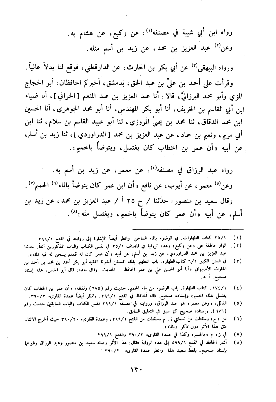 وَقَالَ سَعِيدُ بْنُ مَنْصُورٍ حَدَّثنا ح 25 أعبد الْعَزِيز بن مُحَمَّد عَن زَيْدُ بْنُ أَسْلَمَ عَنْ أَبِيهِ ((أَنَّ عُمَرَ كَانَ يَتَوَضَّأُ بِالْحَمِيمِ ويغتسل مِنْهُ))