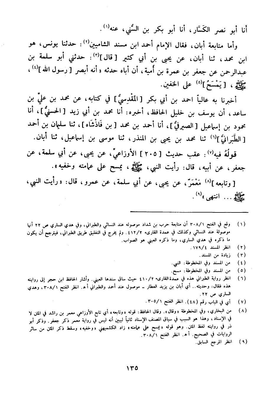 قَوْله فِيهِ عَقِبَ حَدِيثِ [205] الأَوْزَاعِيِّ عَنْ يَحْيَى عَنْ أَبِي سَلَمَةَ عَنْ جَعْفَرٍ عَنْ أَبِيهِ قَالَ رَأَيْتُ النَّبِيَّ صَلَّى اللَّهُ عَلَيْهِ وَسَلَّمَ يَمْسَحُ عَلَى عِمَامَتِهِ وَخُفَّيْهِ