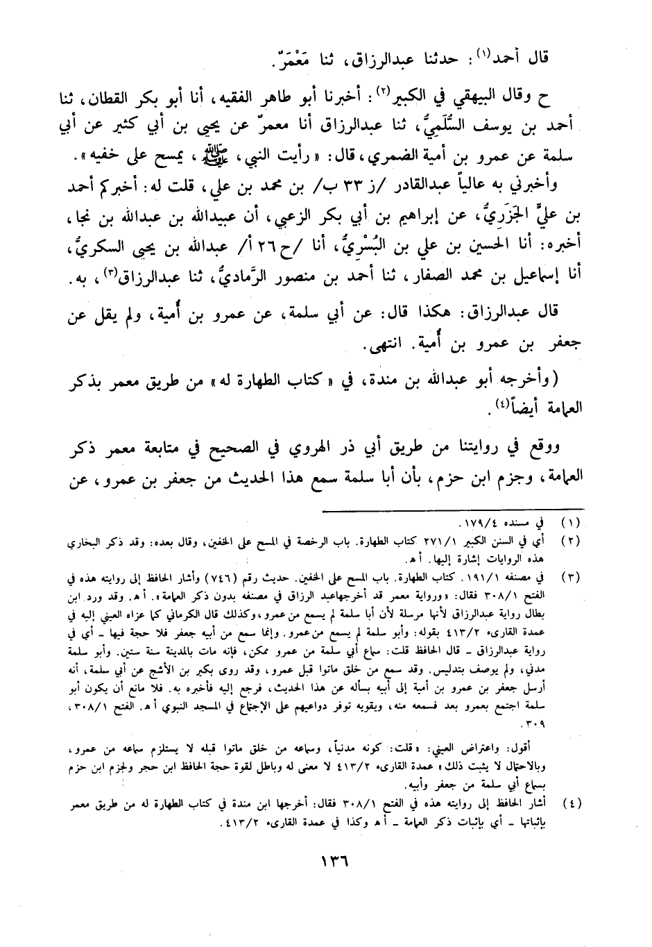 ح وَقَالَ الْبَيْهَقِيُّ فِي الْكَبِيرِ أَخْبَرَنَا أَبُو طَاهِرٍ الْفَقِيهُ أَنا أَبُو بَكْرٍ الْقَطَّانُ ثَنَا أَحْمَدُ بْنُ يُوسُفَ السُّلَمِيُّ ثَنَا عَبْدُ الرَّزَّاقِ أَنا مَعْمَرٌ عَنْ يَحْيَى بْنِ أَبِي كَثِيرٍ عَن أبي سَلمَة عَن عَمْرو بْنِ أُمَيَّةَ الضَّمْرِيِّ قَالَ ((رَأَيْتُ النَّبِي صلى الله عَلَيْهِ وَسلم يَمْسَحُ عَلَى خُفَّيْهِ))