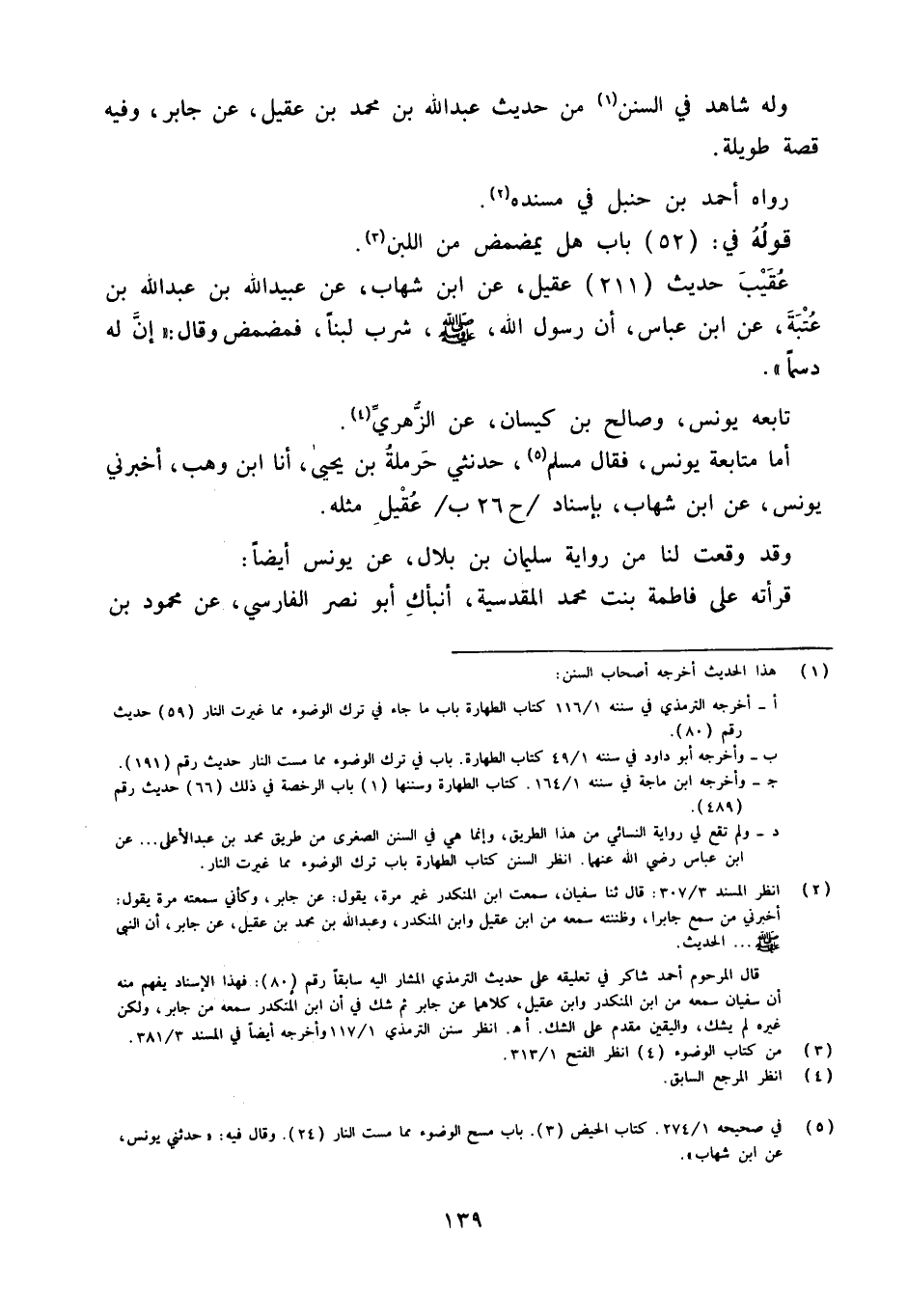 عُقَيْبَ حَدِيثِ (211) عُقَيْلٍ عَنِ ابْنِ شِهَابٍ عَنْ عُبَيْدِ اللَّهِ بْنِ عَبْدِ اللَّهِ بْنِ عُتْبَةَ عَنِ ابْنِ عَبَّاسٍ أَنَّ رَسُولَ اللَّهِ صَلَّى اللَّهُ عَلَيْهِ وَسَلَّمَ شَرِبَ لَبَنًا فَمَضْمَضَ وَقَالَ ((إِنَّ لَهُ دسما))