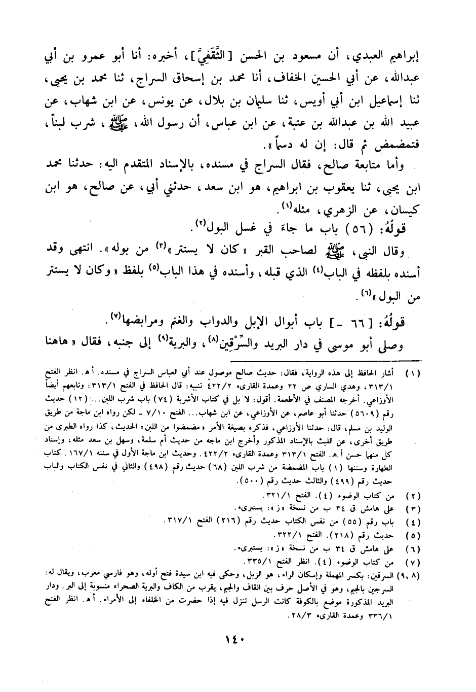 وَقَالَ النَّبِي صلى الله عَلَيْهِ وَسلم لصَاحب الْقَبْر ((كَانَ لَا يسْتَتر من بَوْله انْتهى وَقد أسْندهُ بِلَفْظِهِ فِي الْبَاب الَّذِي قبله وأسنده فِي هَذَا الْبَاب بِلَفْظ ((وَكَانَ لَا يسْتَتر من الْبَوْل)) قَوْله [66]