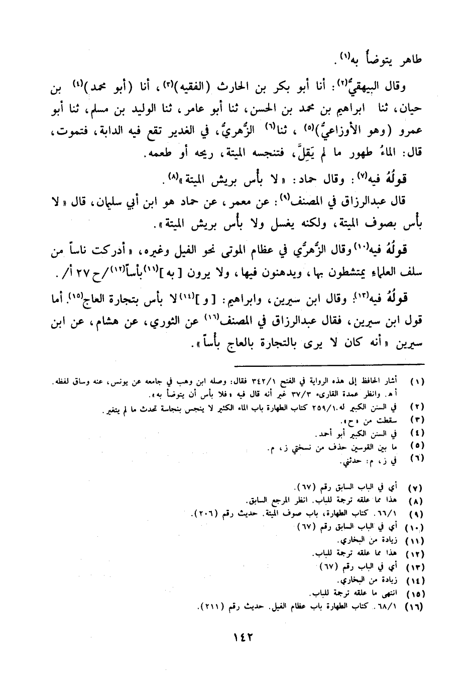 وَقَالَ الْبَيْهَقِيّ أَنا أَبُو بكر بن الْحَارِث (الْفَقِيه) أَنا (أَبُو مُحَمَّد) بن حَيَّان ثَنَا إِبْرَاهِيم بن مُحَمَّد بن الْحسن ثَنَا أَبُو عَامر ثَنَا الْوَلِيد بن مُسلم ثَنَا أَبُو عَمْرو (وَهُوَ الْأَوْزَاعِيّ) ثَنَا الزُّهْرِيّ فِي الغدير تقع فِيهِ الدَّابَّة فتموت قَالَ المَاء طهُور مَا لم يقل فتنجسه الْميتَة رِيحه أَو طعمه