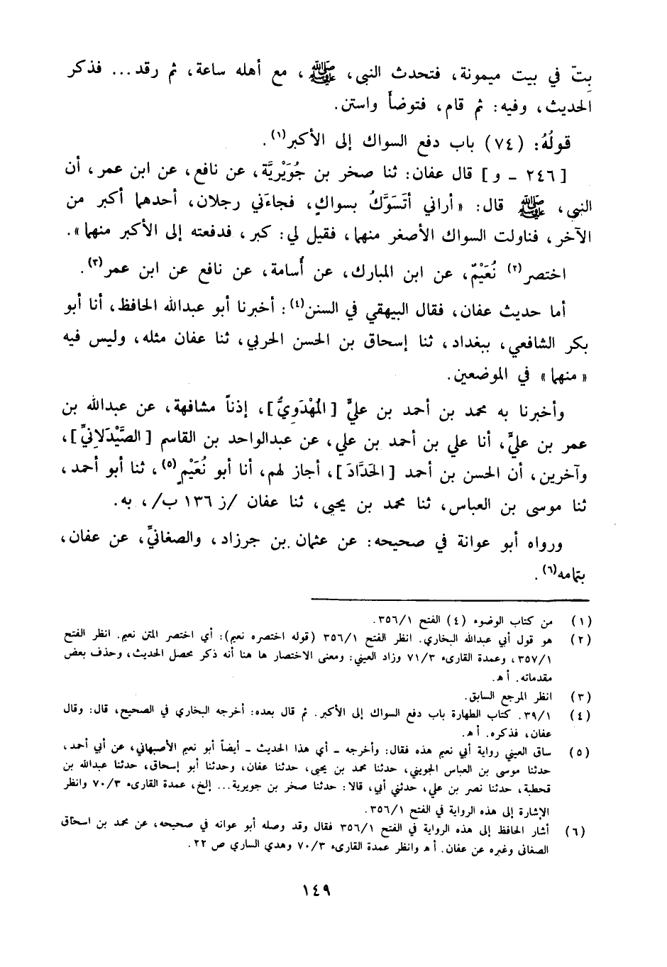 أما حَدِيث عَفَّان فَقَالَ الْبَيْهَقِيّ فِي السّنَن أَخْبَرَنَا أَبُو عبد الله الْحَافِظ أَنا أَبُو بكر الشَّافِعِي بِبَغْدَاد ثَنَا إِسْحَاقُ بْنُ الْحَسَنِ الْحَرْبِيُّ ثَنَا عَفَّان مثله وَلَيْسَ فِيهِ ((مِنْهُمَا)) فِي الْمَوْضِعَيْنِ