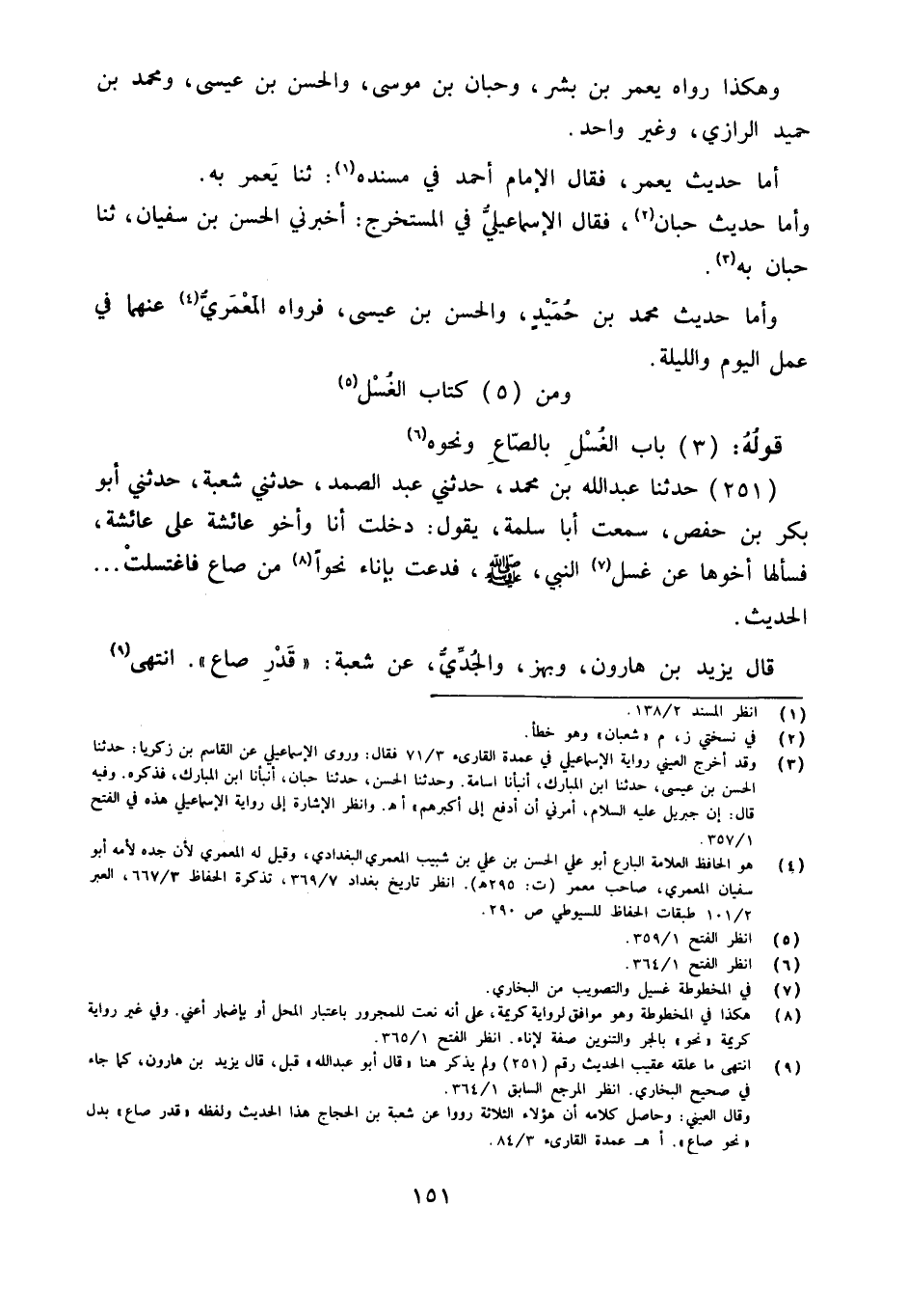 (251) حَدَّثنا عَبْدُ اللَّهِ بْنُ مُحَمَّدٍ حَدَّثَني عَبْدُ الصَّمَدِ حَدَّثَني شُعْبَةُ حَدَّثَني أَبُو بَكْرِ بْنُ حَفْصٍ سَمِعت أَبَا سَلَمَةَ يَقُولُ دَخَلْتُ أَنَا وَأَخُو عَائِشَةَ عَلَى عَائِشَةَ فَسَأَلَهَا أَخُوهَا عَنْ غُسْلِ النَّبِي صلى الله عَلَيْهِ وَسلم فَدَعَتْ بِإِنَاءٍ نَحْوًا مِنْ صَاعٍ فَاغْتَسَلَتْ الْحَدِيثَ