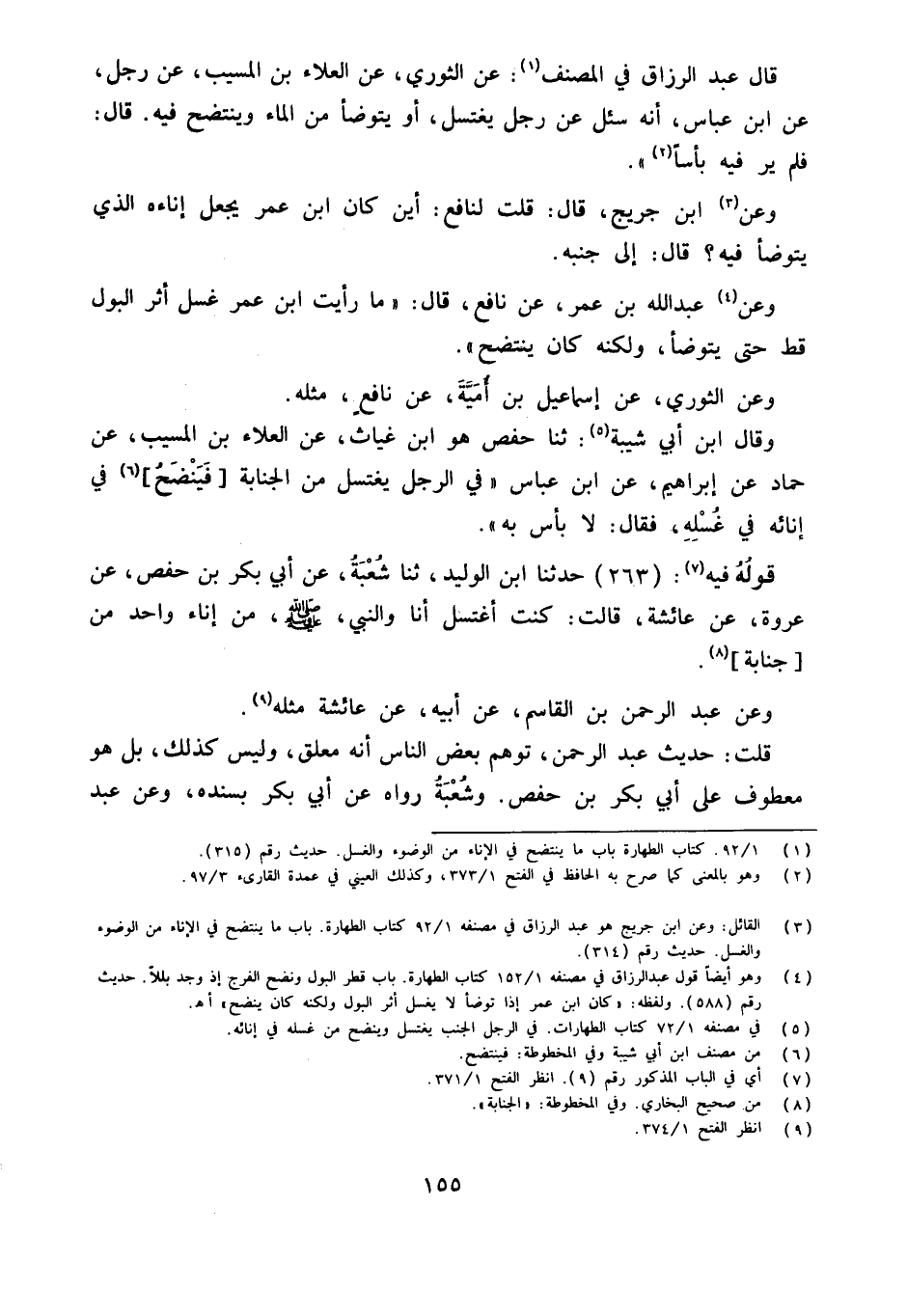 قَالَ عبد الرَّزَّاق فِي المُصَنّف عَنِ الثَّوْرِيِّ عَنِ الْعَلاءِ بْنِ الْمُسَيَّبِ عَنْ رَجُلٍ عَنِ ابْنِ عَبَّاسٍ أَنَّهُ سُئِلَ عَنْ رَجُلٍ يَغْتَسِلُ أَوْ يَتَوَضَّأُ مِنَ الْمَاءِ وَيَنْتَضِحُ فِيهِ قَالَ فَلَمْ يَرَ فِيهِ بَأْسًا))