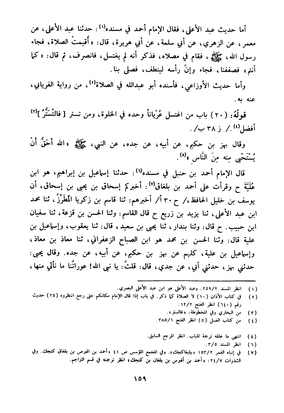 قَالَ الإِمَام أَحْمد بن حَنْبَل فِي مُسْنده حَدَّثنا إِسْمَاعِيلُ بْنُ إِبْرَاهِيمَ هُوَ ابْنُ عُلَيَّةَ وَقرأت عَلَى أَحْمَدَ بْنِ بلغاق أَخْبَرَكُمْ إِسْحَاقُ بْنُ يَحْيَى بْنِ إِسْحَاقَ أَنَّ يُوسُفَ بْنَ خَلِيلٍ الْحَافِظ ح 30 أأَخْبَرَهُمْ ثَنَا قَاسِمُ بْنُ زَكَرِيَّا الْمُطَرز ثَنَا مُحَمَّد ابْن عَبْدِ الأَعْلَى ثَنَا يَزِيدُ بْنُ زُرَيْعٍ ح قَالَ الْقَاسِمُ وَثنا الْحَسَنُ بْنُ قَزَعَةَ ثَنَا سُفْيَانُ ابْن حَبِيبٍ ح قَالَ وَثنا بُنْدَارٌ ثَنَا يَحْيَى بْنُ سَعِيدٍ قَالَ ثَنَا يَعْقُوب وَإِسْمَاعِيل بن عُلَيَّةَ قَالَ وَثنا الْحَسَنُ بْنُ مُحَمَّدٍ هُوَ ابْنُ الصَّبَّاحِ الزَّعْفَرَانِيُّ ثَنَا مُعَاذُ بْنُ مُعَاذٍ وَإِسْمَاعِيلُ بن عُلَيَّةَ كُلُّهُمْ عَنْ بَهْزِ بْنِ حَكِيمٍ عَنْ أَبِيهِ عَنْ جَدِّهِ وَقَالَ يَحْيَى حَدَّثَني بَهْزٌ حَدَّثَني أَبِي عَنْ جَدِّي قَالَ قُلْتُ يَا نَبِيَّ اللَّهِ عَوْرَاتُنَا مَا نأتي مِنْهَا