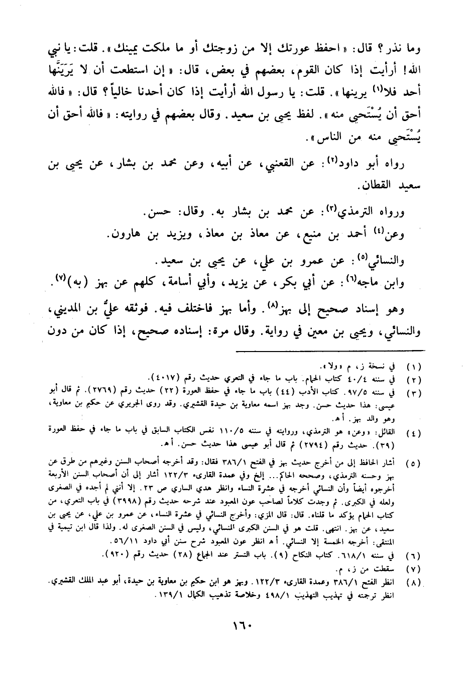 وَمَا نَذَرُ قَالَ ((احْفَظْ عَوْرَتَكَ إِلا مِنْ زَوْجَتِكَ أَوْ مَا مَلَكَتْ يَمِينُكَ)) قُلْتُ يَا نَبِيَّ الله أَرَأَيْت إِذا كَانَ قوم بَعْضُهُمْ فِي بَعْضٍ قَالَ ((إِنِ اسْتَطَعْتَ أَنْ لَا يَرَيَنَّهَا أَحَدٌ فَلا يَرَيَنَّهَا)) قُلْتُ يَا رَسُولَ اللَّهِ أَرَأَيْتَ إِذَا كَانَ أَحَدُنَا خَالِيًا قَالَ ((فَاللَّهُ أَحَقُّ أَنْ يستحى مِنْهُ)) لَفظه يَحْيَى بْنِ سَعِيدٍ وَقَالَ بَعْضُهُمْ فِي رِوَايَتِهِ ((فَاللَّهُ أَحَقُّ أَنْ يُسْتَحَى مِنْهُ مِنَ النَّاسِ))