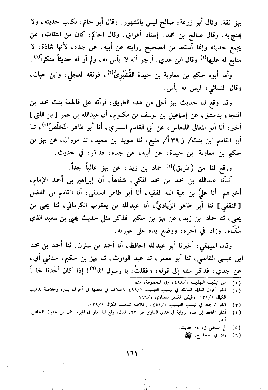 بهز ثِقَة وَقَالَ أَبُو زرْعَة صَالح لَيْسَ بالمشهور وَقَالَ أَبُو حَاتِم يكْتب حَدِيثه وَلَا يحْتَج بِهِ وَقَالَ صَالح بن مُحَمَّد إِسْنَاد أَعْرَابِي وَقَالَ الحكم كَانَ من الثِّقَات مِمَّن يجمع حَدِيثه وَإِنَّمَا أسقط من الصَّحِيح رِوَايَته عَن أَبِيه عَن جده لِأَنَّهَا شَاذَّة لَا متابع لَهُ عَلَيْهَا وَقَالَ ابْن عدي أَرْجُو أَنه لَا بَأْس بِهِ وَلم أر لَهُ حَدِيثا مُنْكرا