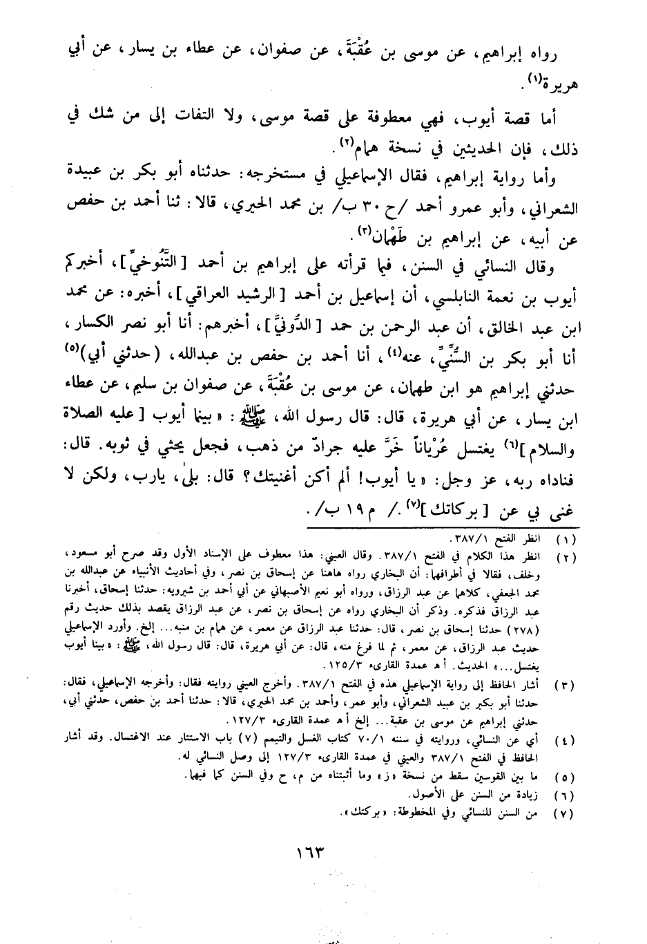 وَقَالَ النَّسَائِيُّ فِي السُّنَنِ فِيمَا قَرَأْتُهُ عَلَى إِبْرَاهِيمَ بْنِ أَحْمَدَ [التَّنُوخِيِّ] أَخْبَرَكُمْ أَيُّوبُ بْنُ نِعْمَةَ النَّابُلُسِيُّ أَنَّ إِسْمَاعِيلَ بْنَ أَحْمَدَ [الرَّشِيدَ الْعِرَاقِيّ] أخبرهُ عَن مُحَمَّد ابْن عَبْدِ الْخَالِقِ أَنَّ عَبْدَ الرَّحْمَنِ بْنَ حَمْدٍ [الدُّونِيَّ] أَخْبَرَهُمْ أَنا أَبُو نصر الكسار أَنا أَبُو بَكْرِ بْنُ السُّنِّيِّ عَنْهُ أَنا أَحْمَدُ بْنُ حَفْصِ بْنِ عَبْدِ اللَّهِ (حَدَّثَني أَبِي) حَدَّثَني إِبْرَاهِيمُ هُوَ ابْنُ طَهْمَانَ عَنْ مُوسَى بْنِ عُقْبَةَ عَنْ صَفْوَانَ بْنِ سليم عَن عَطاء ابْن يَسَارٍ عَنْ أَبِي هُرَيْرَةَ قَالَ قَالَ رَسُول الله صلى الله عَلَيْهِ وَسَلَّمَ ((بَيْنَمَا أَيُّوبُ [عَلَيْهِ الصَّلاةُ وَالسَّلامُ] يَغْتَسِلُ عُرْيَانًا خَرَّ عَلَيْهِ جَرَادٌ مِنْ ذَهَبٍ فَجَعَلَ يَحْثِي فِي ثَوْبِهِ قَالَ فَنَادَاهُ رَبُّهُ عَزَّ وَجَلَّ ((يَا أَيُّوبُ أَلَمْ أَكُنْ أَغْنَيْتُكَ قَالَ بَلَى يَا رَبِّ وَلَكِنْ لَا غِنَى بِي عَن [بركاتك] م 19 ب