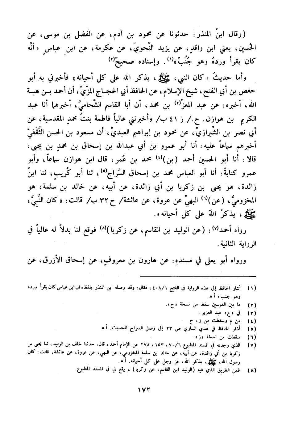 وَأما حَدِيث ((كَانَ النَّبِيُّ صَلَّى اللَّهُ عَلَيْهِ وَسلم يذكر الله على كل أحيانه)) فَأَخْبَرَنِي بِهِ أَبُو حَفْصِ بْنُ أَبِي الْفَتْحِ شَيْخُ الإِسْلامِ عَن الْحَافِظ أبي الْحجَّاج الْمزي أَنَّ أَحْمَدَ بْنَ هِبَةِ اللَّهِ أَخْبَرَهُ عَنْ عَبْدِ الْمُعِزِّ بْنِ مُحَمَّدٍ أَنَّ أَبَا الْقَاسِمِ الشَّحَّامِيَّ أَخْبَرَهُمَا أَنا عَبْدُ الْكَرِيمِ بْنُ هوَازن ح ز 41 ب وَأَخْبَرَتْنِي عَالِيًا فَاطِمَةُ بِنْتُ مُحَمَّدٍ الْمَقْدِسِيَّةُ عَنْ أَبِي نَصْرٍ الشِّيرَازِيِّ عَنْ مَحْمُودِ بْنِ إِبْرَاهِيمَ الْعَبْدِيِّ أَنَّ مَسْعُودَ بْنَ الْحَسَنِ الثَّقَفِيَّ أَخْبَرَهُمْ سَمَاعًا عَلَيْهِ أَنا أَبُو عَمْرِو بْنُ أَبِي عَبْدِ اللَّهِ بْنُ إِسْحَاقَ بْنِ مُحَمَّدِ بْنِ يَحْيَى قَالا أَنا أَبُو الْحُسَيْنِ أَحْمد (بن) مُحَمَّد بن عمر قَالَ ابْنُ هَوَازِنَ سَمَاعًا وَأَبُو عَمْرٍو كِتَابَةً أَنا أَبُو الْعَبَّاسِ مُحَمَّدُ بْنُ إِسْحَاقَ السَّرَّاجُ ثَنَا أَبُو كُرَيْبٍ ثَنَا ابْنُ زَائِدَةَ هُوَ يَحْيَى بْنُ زَكَرِيَّا بْنِ أَبِي زَائِدَةَ عَنْ أَبِيهِ عَنْ خَالِدِ بْنِ سَلَمَةَ هُوَ الْمَخْزُومِيُّ (عَنِ) الْبَهِيِّ بْنِ عُرْوَةَ عَنْ عَائِشَة ح 32 ب قَالَتْ ((كَانَ النَّبِيُّ صَلَّى اللَّهُ عَلَيْهِ وَسلم يذكر الله كُلِّ أَحْيَانِهِ))