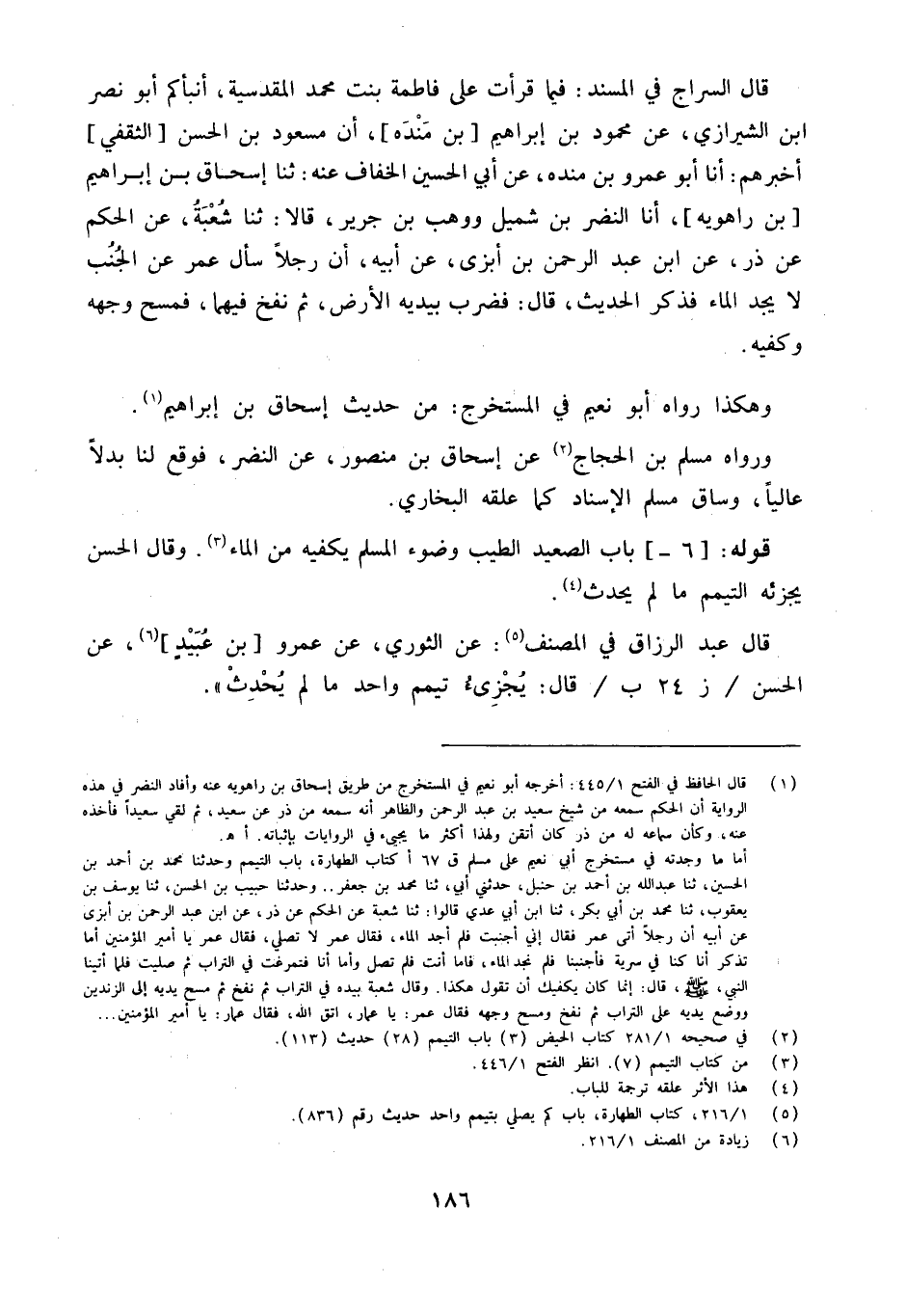 قَالَ السَّرَّاجُ فِي الْمُسْنَدِ فِيمَا قَرَأت عَلَى فَاطِمَةَ بِنْتِ مُحَمَّدٍ المقدسية أنبأكم أَبُو نصر ابْن الشِّيرَازِيِّ عَنْ مَحْمُودِ بْنِ إِبْرَاهِيمَ [بْنِ مَنْدَهْ] أَنَّ مَسْعُودَ بْنَ الْحَسَنِ [الثَّقَفِيَّ] أَخْبَرَهُمْ أَنا أَبُو عَمْرِو بْنُ مَنْدَهْ عَنْ أَبِي الْحُسَيْنِ الْخَفَّافِ عَنْهُ ثَنَا إِسْحَاقُ بْنُ إِبْرَاهِيمَ [بْنِ رَاهَوَيْهِ] أَنا النَّضْرُ بْنُ شُمَيْلٍ وَوَهْبُ بْنُ جَرِيرٍ قَالا ثَنَا شُعْبَةُ عَنِ الْحَكَمِ عَنْ ذَرٍّ عَنِ ابْنِ عَبْدِ الرَّحْمَنِ بْنِ أَبْزَى عَنْ أَبِيهِ أَنَّ رَجُلا سَأَلَ عُمَرَ عَنِ الْجُنُبِ لَا يَجِدُ الْمَاءَ فَذَكَرَ الْحَدِيثَ قَالَ فَضَرَبَ بِيَدَيْهِ الأَرْضَ ثُمَّ نَفَخَ فِيهِمَا فَمَسَحَ وَجْهَهُ وَكَفَّيْهِ