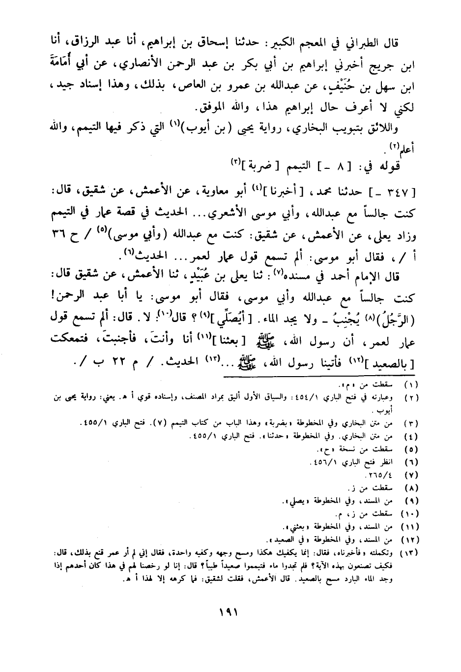 قَالَ الإِمَامُ أَحْمَدُ فِي مُسْنَدِهِ ثَنَا يَعْلَى بْنُ عُبَيْدٍ ثَنَا الأَعْمَشِ عَنْ شَقِيقٍ قَالَ كُنْتُ جَالِسًا مَعَ عَبْدِ اللَّهِ وَأَبِي مُوسَى فَقَالَ أَبُو مُوسَى يَا أَبَا عَبْدِ الرَّحْمَنِ (الرَّجُلُ) يُجْنِبُ وَلا يَجِدُ الْمَاءَ [أَيُصَلِّي] قَالَ لَا قَالَ أَلَمْ تَسْمَعْ قَوْلَ عَمَّارٍ لِعُمَرَ أَنَّ رَسُولَ اللَّهِ صَلَّى اللَّهُ عَلَيْهِ وَسَلَّمَ [بَعَثنا] أَنَا وَأَنْتَ فَأَجْنَبْتُ فَتَمَعَّكْتُ [بِالصَّعِيدِ] فَأَتَيْنَا رَسُولَ اللَّهِ صَلَّى اللَّهُ عَلَيْهِ وَسلم الحَدِيث م 22 ب