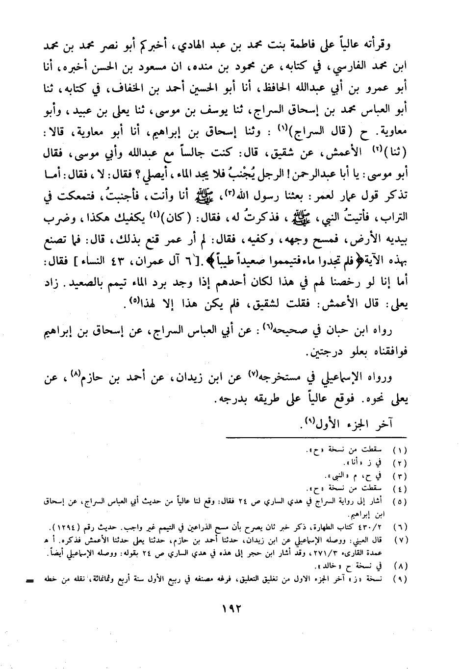 وَقَرَأْتُهُ عَالِيًا عَلَى فَاطِمَةَ بِنْتِ مُحَمَّد بن عبد الْهَادِي أخْبركُم أَبُو نصر مُحَمَّد بن مُحَمَّد ابْن مُحَمَّد الْفَارِسِي فِي كِتَابه عَن مَحْمُود بن مَنْدَه أَن مَسْعُود بن الْحسن أخبرهُ أَنا أَبُو عَمْرِو بْنُ أَبِي عَبْدِ اللَّهِ الْحَافِظ أَنا أَبُو الْحُسَيْن أَحْمد بن الْخفاف فِي كِتَابه ثَنَا أَبُو الْعَبَّاسِ مُحَمَّدُ بْنُ إِسْحَاقَ السراج ثَنَا يُوسُف بن مُوسَى ثَنَا يعلى بن عبيد وَأَبُو مُعَاوِيَة ح (قَالَ السراج) وثنا إِسْحَاق بن إِبْرَاهِيم أَنا أَبُو مُعَاوِيَة قَالَا (ثَنَا) الْأَعْمَش عَن شَقِيقٍ قَالَ كُنْتُ جَالِسًا مَعَ عَبْدِ اللَّهِ وَأَبِي مُوسَى فَقَالَ أَبُو مُوسَى يَا أَبَا عَبْدِ الرَّحْمَن الرجل يجنب فَلَا يجد المَاء أيصلي فَقَالَ لَا فَقَالَ أما تذكر قَول عمار لعمر بعثنَا رَسُول الله صلى الله عَلَيْهِ وَسلم أَنا وَأَنت فأجنبت فتمعكت فِي التُّرَاب فَأتيت النَّبِي صلى الله عَلَيْهِ وَسلم فَذكرت لَهُ فَقَالَ (كَانَ) يَكْفِيك هَكَذَا وَضرب بيدَيْهِ الأَرْض فَمسح وَجهه وكفيه فَقَالَ لم أر عمر قنع بذلك قَالَ فَمَا تصنع بِهَذِهِ الْآيَة {فَلَمْ تَجِدُوا مَاءً فَتَيَمَّمُوا صَعِيدا طيبا} [6 آل عمرَان 43 النِّسَاء] فَقَالَ أما أَنا لَو رخصنا لَهُم فِي هَذَا لَكَانَ أحدهم إِذا وحد برد المَاء تيَمّم بالصعيد زَاد يعلى قَالَ الْأَعْمَش فَقلت لشقيق فَلم يكن هَذَا إِلَّا لهَذَا