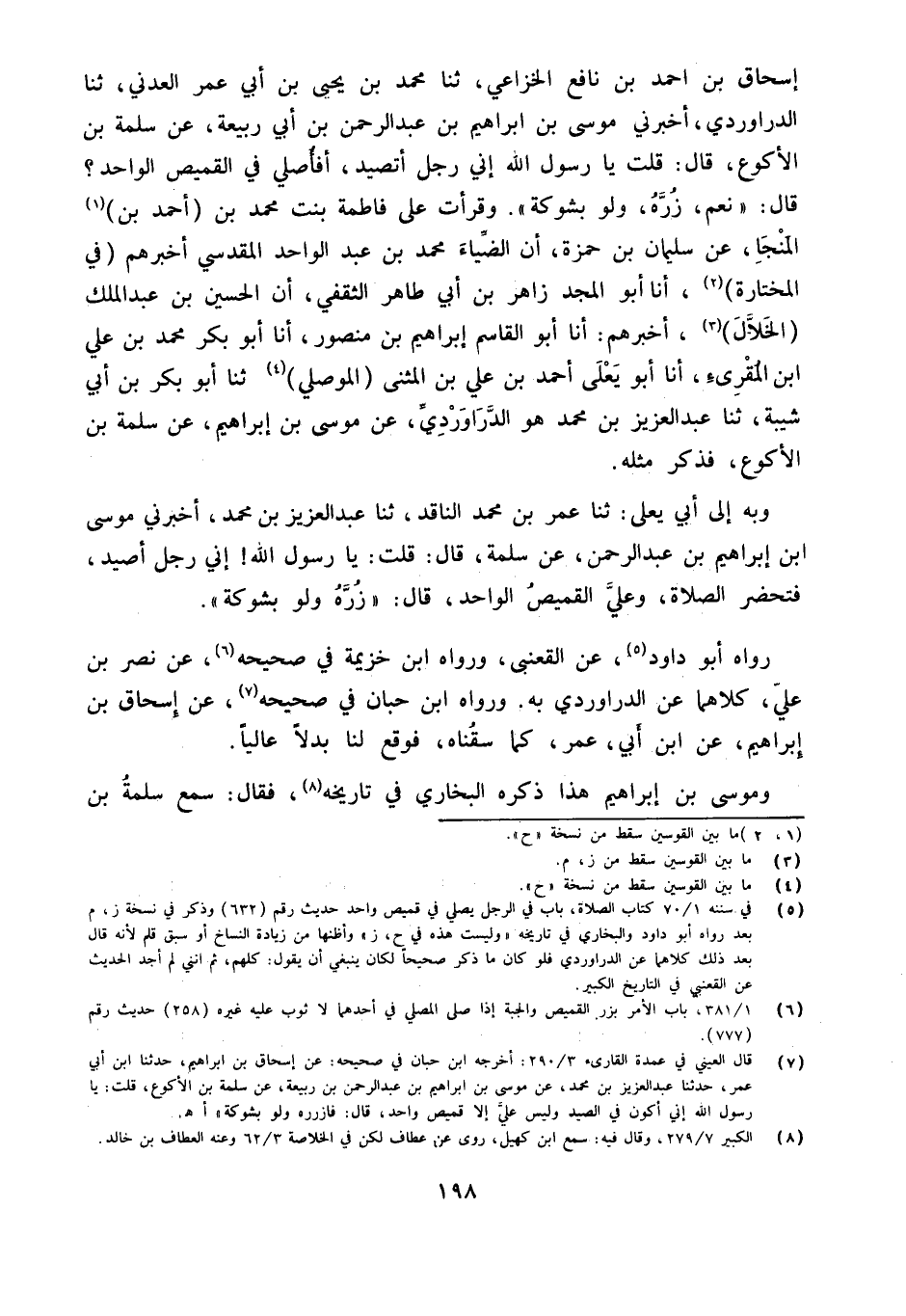 إِسْحَاقُ بْنُ أَحْمَدَ بْنِ نَافِعٍ الْخُزَاعِيُّ ثَنَا مُحَمَّدُ بْنُ يَحْيَى بْنِ أَبِي عُمَرَ الْعَدَنِيُّ ثَنَا الدَّرَاوَرْدِيُّ أَخْبَرَنِي مُوسَى بْنُ إِبْرَاهِيمَ بْنِ عَبْدِ الرَّحْمَنِ بْنِ أَبِي رَبِيعَةَ عَنْ سَلَمَةَ بْنِ الأَكْوَعِ قَالَ قُلْتُ يَا رَسُولَ اللَّهِ إِنِّي رَجُلٌ أَتَصَيَّدُ أَفَأُصَلِّي فِي الْقَمِيصِ الْوَاحِدِ قَالَ ((نَعَمْ زُرَّهُ وَلَوْ بِشَوْكَةٍ)) وَقرأت عَلَى فَاطِمَةَ بِنْتِ مُحَمَّدِ بْنِ (أَحْمَدَ بْنِ) الْمُنَجَّا عَنْ سُلَيْمَانَ بْنِ حَمْزَةَ أَن الضياء مُحَمَّد بن عبد الْوَاحِدِ الْمَقْدِسِيَّ أَخْبَرَهُمْ (فِي الْمُخْتَارَةِ) أَنا أَبُو الْمَجْدِ زَاهِرُ بْنُ أَبِي طَاهِرٍ الثَّقَفِيُّ أَنَّ الْحُسَيْنَ بْنَ عَبْدِ الْمَلِكِ (الْخَلالَ) أَخْبَرَهُمْ أَنا أَبُو الْقَاسِمِ إِبْرَاهِيمُ بْنُ مَنْصُورٍ أَنا أَبُو بَكْرٍ مُحَمَّدُ بن عَليّ ابْن الْمُقْرِئِ أَنا أَبُو يَعْلَى أَحْمَدُ بْنُ عَلِيِّ بْنِ الْمُثَنَّى (الْمَوْصِلِيُّ) ثَنَا أَبُو بكر بن أبي شَيْبَةَ ثَنَا عَبْدُ الْعَزِيزِ بْنُ مُحَمَّدٍ هُوَ الدَّرَاوَرْدِيُّ عَنْ مُوسَى بْنِ إِبْرَاهِيمَ عَنْ سَلَمَةَ بْنِ الأَكْوَعِ فَذَكَرَ مِثْلَهُ