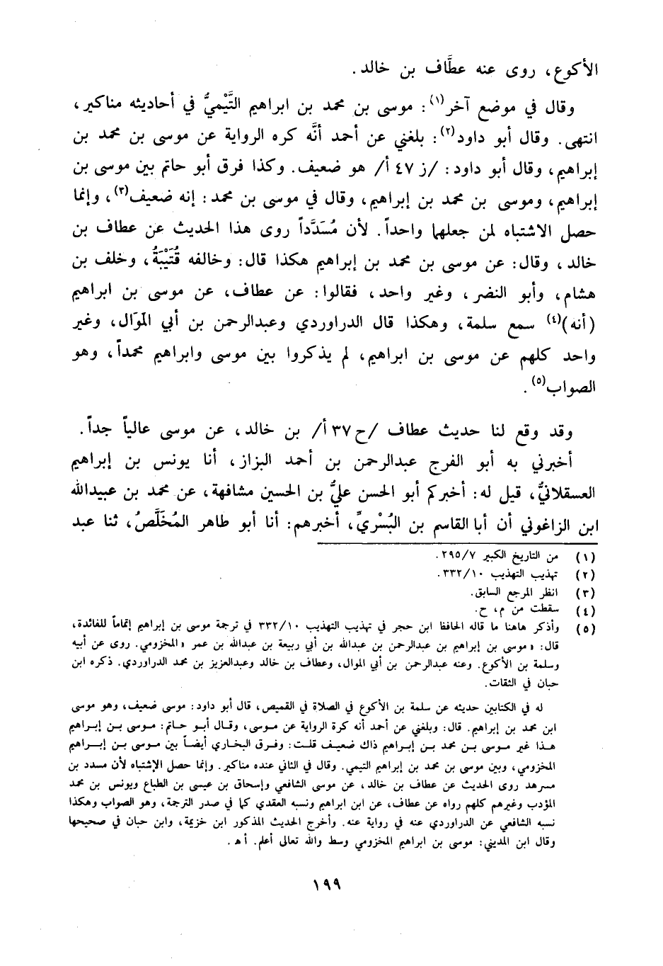 وَقَالَ فِي مَوضِع آخر مُوسَى بن مُحَمَّد بن إِبْرَاهِيم التَّيْمِيّ فِي أَحَادِيثه مَنَاكِير انْتهى وَقَالَ أَبُو دَاوُد بَلغنِي عَن أَحْمد أَنه كره الرِّوَايَة عَن مُوسَى بن مُحَمَّد بن إِبْرَاهِيم وَقَالَ أَبُو دَاوُد ز 47 أهُوَ ضَعِيف وَكَذَا فرق أَبُو حَاتِم بَين مُوسَى بن إِبْرَاهِيم ومُوسَى بن مُحَمَّد بن إِبْرَاهِيم وَقَالَ فِي مُوسَى بن مُحَمَّد إِنَّه ضَعِيف وَإِنَّمَا حصل الِاشْتِبَاه لمن جَعلهمَا وَاحِدًا لِأَن مُسَددًا روى هَذَا الحَدِيث عَن عطاف بن خَالِد وَقَالَ عَن مُوسَى بن مُحَمَّد بن إِبْرَاهِيم هَكَذَا قَالَ وَخَالفهُ قُتَيْبَة وَخلف بن هِشَام وَأَبُو النَّضر وَغير وَاحِد فَقَالُوا عَن عطاف عَن مُوسَى بن إِبْرَاهِيم (أَنه) سمع سَلمَة وَهَكَذَا قَالَ الدَّرَاورْدِي وَعبد الرَّحْمَن بن أبي الموال وَغير وَاحِد كلهم عَن مُوسَى بن إِبْرَاهِيم لم يذكرُوا بَين مُوسَى وَإِبْرَاهِيم مُحَمَّدًا وَهُوَ الصَّوَاب