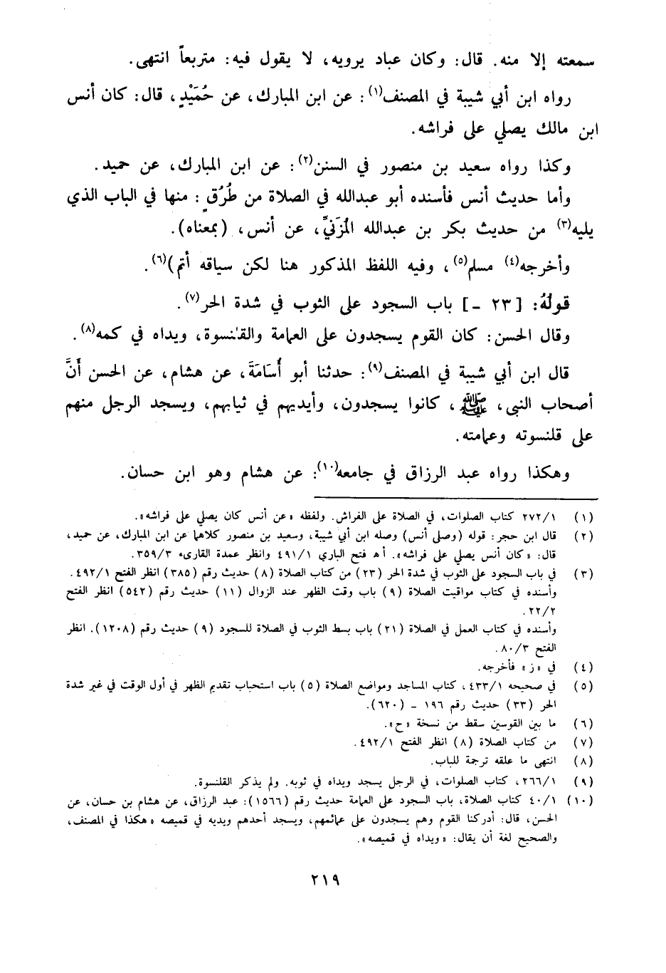 قَالَ ابْن أبي شيبَة فِي المُصَنّف حَدَّثنا أَبُو أُسَامَةَ عَنْ هِشَامٍ عَنِ الْحَسَنِ أَنَّ أَصْحَابَ النَّبِي صلى الله عَلَيْهِ وَسلم كَانُوا يَسْجُدُونَ وَأَيْدِيهِمْ فِي ثِيَابِهِمْ وَيَسْجُدُ الرَّجُلُ مِنْهُمْ عَلَى قَلَنْسُوَتِهِ وَعِمَامَتِهِ