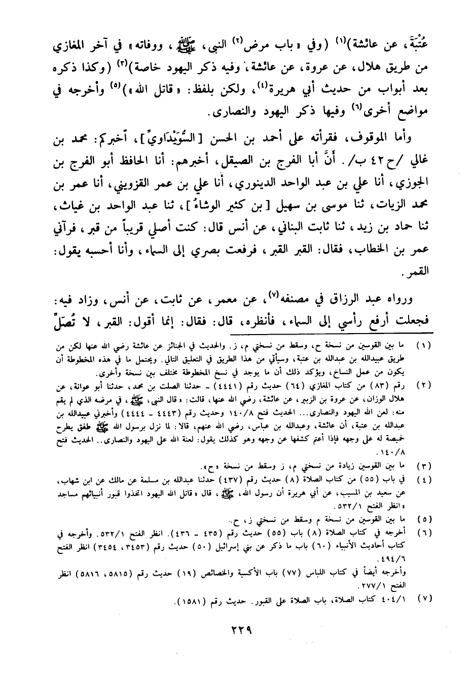 وَأما الْمَوْقُوف فَقَرَأْتُهُ عَلَى أَحْمَدَ بْنِ الْحَسَنِ [السُّوَيْدَاوِيِّ] أَخْبَرَكُمْ مُحَمَّد بن غالي ح 42 ب أَنَّ أَبَا الْفَرَجِ بْنَ الصَّيْقَلِ أَخْبَرَهُمْ أَنا الْحَافِظُ أَبُو الْفَرَجِ بْنُ الْجَوْزِيِّ أَنا عَلِيُّ بْنُ عَبْدِ الْوَاحِدِ الدِّينَوَرِيُّ أَنا عَلِيُّ بْنُ عُمَرَ الْقَزْوِينِيُّ أَنا عُمَرُ بْنُ مُحَمَّدٍ الزَّيَّاتُ ثَنَا مُوسَى بْنُ سُهَيْلِ [بْنِ كَثِيرٍ الْوَشَّاءُ] ثَنَا عَبْدُ الْوَاحِدِ بْنُ غِيَاثٍ ثَنَا حَمَّاد بن زيد ثَنَا ثَابِتٌ الْبُنَانِيُّ عَنْ أَنَسٍ قَالَ كُنْتُ أُصَلِّي قَرِيبًا مِنْ قَبْرٍ فَرَآنِي عُمَرُ بْنُ الْخَطَّابِ فَقَالَ الْقَبْرَ الْقَبْرَ فَرَفَعْتُ بَصَرِي إِلَى السَّمَاءِ وَأَنَا أَحْسِبُهُ يَقُولُ الْقَمَرَ