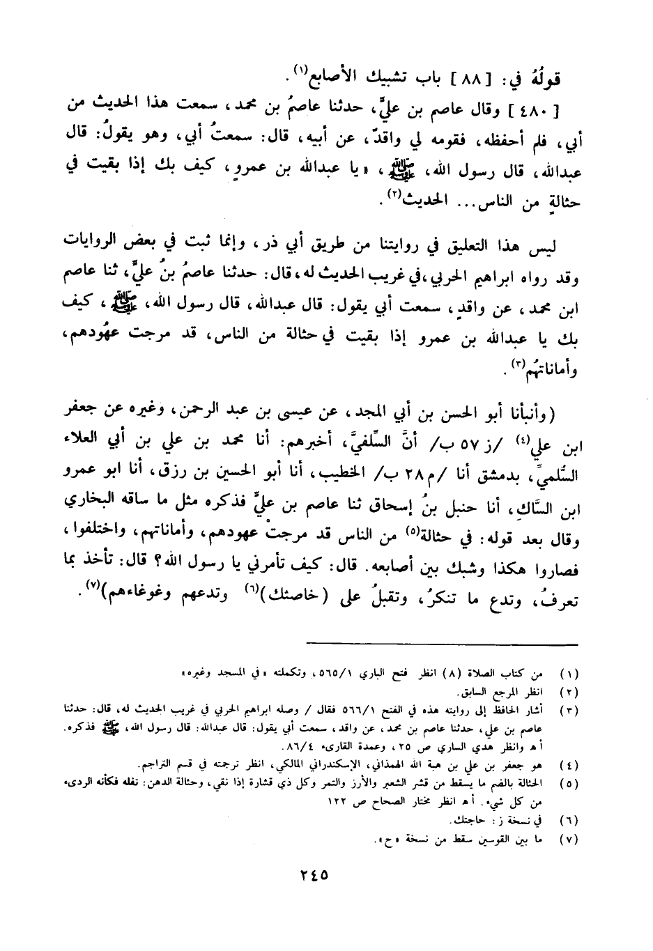 (وأنبأنا أَبُو الْحسن بن أبي الْمجد عَن عِيسَى بن عبد الرَّحْمَن وَغَيره عَن جَعْفَر ابْن عَليّ ز 57 ب أَن السلَفِي أخْبرهُم أَنا مُحَمَّد بن عَليّ بن أبي الْعَلَاء السّلمِيّ بِدِمَشْق أَنا م 28 ب الْخَطِيب أَنا أَبُو الْحُسَيْن بن رزق أَنا أَبُو عَمْرو ابْن الساك أَنا حَنْبَل بن إِسْحَاق ثَنَا عَاصِم بن عَليّ فَذكره مثل مَا سَاقه البُخَارِيّ وَقَالَ بعد قَوْله فِي حثالة من النَّاس قد مرجت عهودهم وأماناتهم وَاخْتلفُوا فصاروا هَكَذَا وَشَبك بَين أَصَابِعه قَالَ كَيفَ تَأْمُرنِي يَا رَسُول الله قَالَ تَأْخُذ بِمَا تعرف وَتَدَع مَا تنكر وَتقبل على (خاصتك) وتدعهم وغوغاءهم)