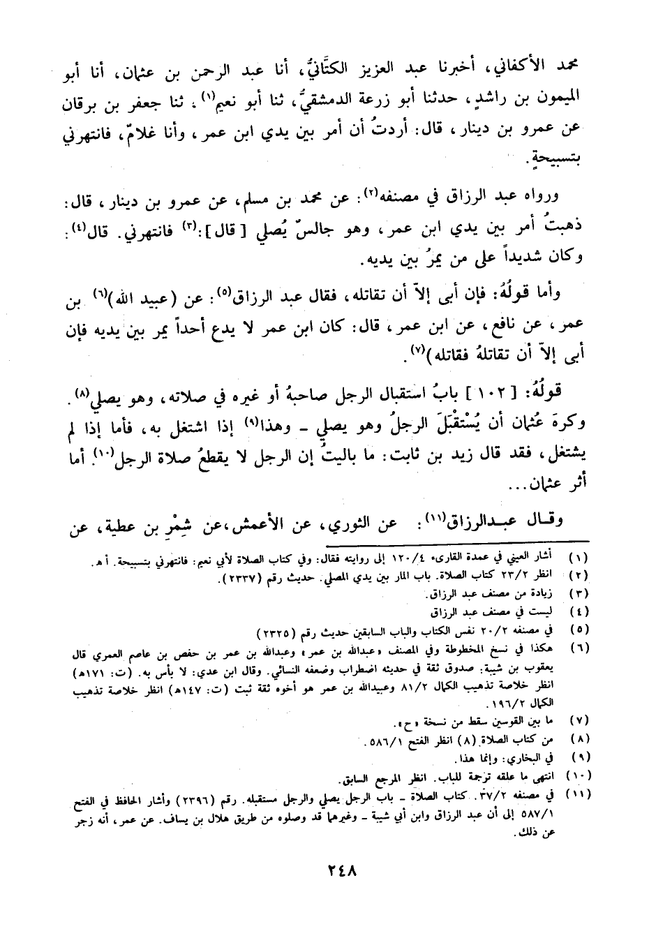 وَرَوَاهُ عبد الرَّزَّاق فِي مُصَنفه عَنْ مُحَمَّدِ بْنِ مُسْلِمٍ عَنْ عَمْرِو بْنِ دِينَارٍ قَالَ ذَهَبْتُ أَمُرُّ بَيْنَ يَدَيِ ابْنِ عُمَرَ وَهُوَ جَالِسٌ يُصَلِّي [قَالَ] فَانْتَهَرَنِي قَالَ وَكَانَ شَدِيدًا عَلَى مَنْ يَمُرُّ بَيْنَ يَدَيْهِ