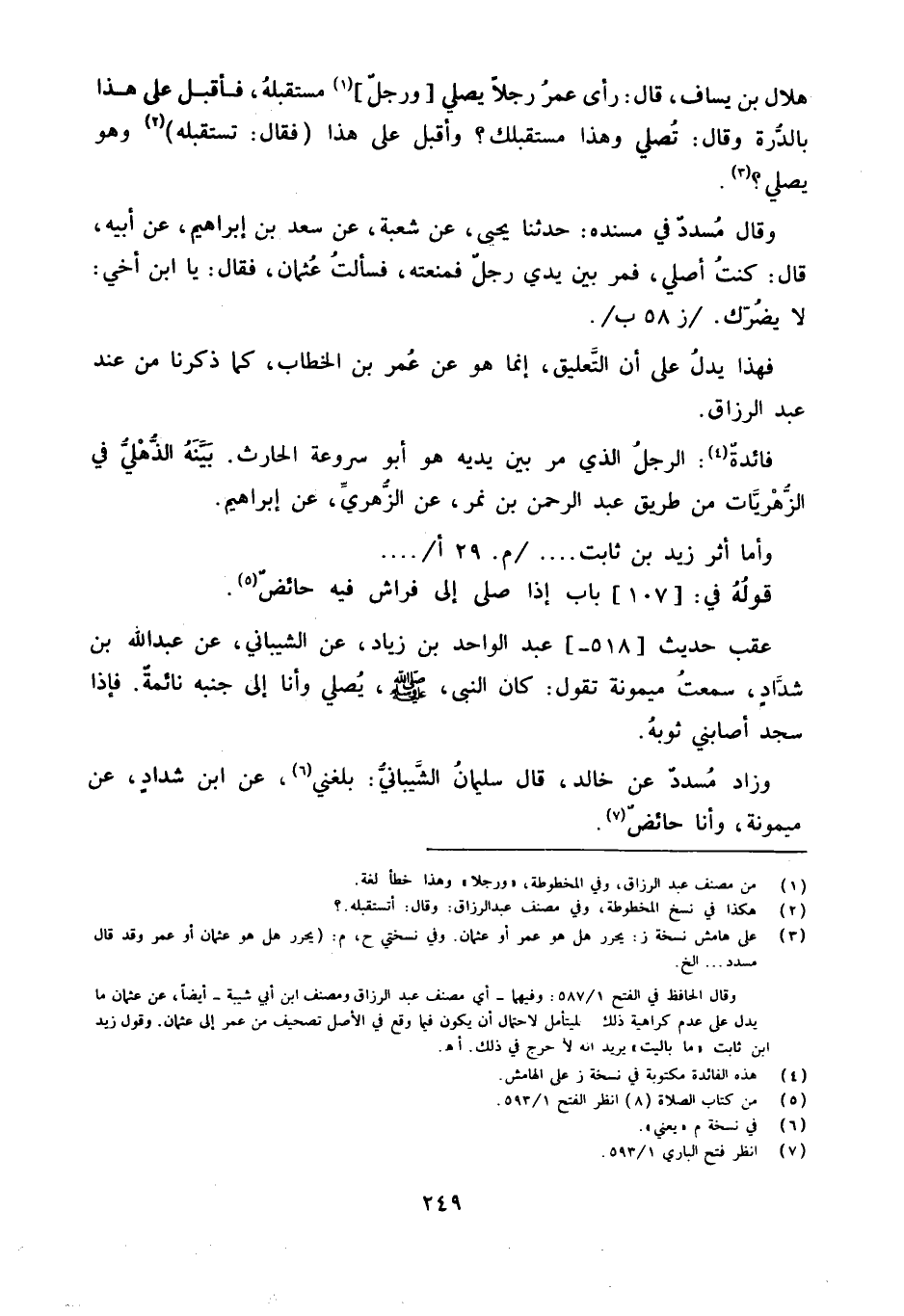 وَقَالَ مُسَدَّدٌ فِي مُسْنَدِهِ حَدَّثنا يَحْيَى عَنْ شُعْبَةَ عَنْ سَعْدِ بْنِ إِبْرَاهِيمَ عَنْ أَبِيهِ قَالَ كُنْتُ أُصَلِّي فَمَرَّ بَيْنَ يَدَيَّ رَجُلٌ فَمَنَعْتُهُ فَسَأَلْتُ عُثْمَانَ فَقَالَ يَا ابْن أخي لَا يَضرك ز 58 ب