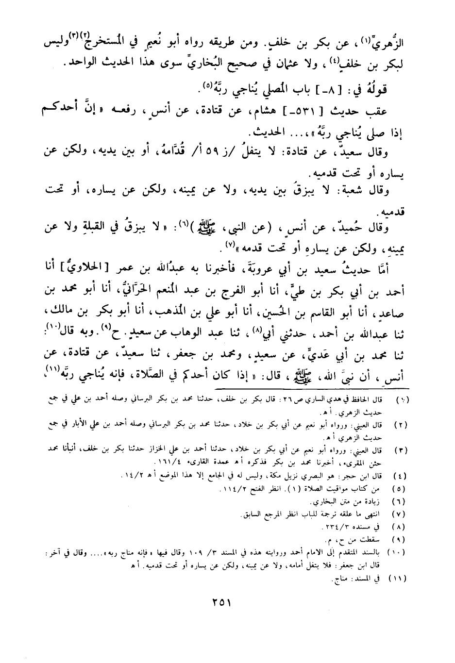 أما حَدِيثُ سَعِيدِ بْنِ أَبِي عَرُوبَةَ فَأَخْبَرَنَا بِهِ عَبْدُ اللَّهِ بْنُ عُمَرَ [الْحَلاوِيُّ] أَنا أَحْمَدُ بْنُ أَبِي بَكْرِ بْنِ طَيٍّ أَنا أَبُو الْفَرَجِ بْنُ عَبْدِ الْمُنْعِمِ الْحَرَّانِيُّ أَنا أَبُو مُحَمَّدِ بْنُ صَاعِدٍ أَنا أَبُو الْقَاسِمِ بْنُ الْحُسَيْنِ أَنا أَبُو عَلِيِّ بن الْمَذْهَب أَنا أَبُو بكر بْنُ مَالِكٍ ثَنَا عَبْدُ اللَّهِ بن أَحْمد حَدَّثَني أبي ثَنَا عَبْدُ الْوَهَّابِ عَنْ سَعِيدٍ ح وَبِهِ قَالَ ثَنَا مُحَمَّدُ بْنُ أَبِي عَدِيٍّ عَنْ سَعِيدٍ وَمُحَمَّدِ بْنِ جَعْفَرٍ ثَنَا سَعِيدٌ عَنْ قَتَادَةَ عَنْ أَنَسٍ أَنَّ نَبِيَّ الله صلى الله عَلَيْهِ وَسلم قَالَ ((إِذَا كَانَ أَحَدُكُمْ فِي الصَّلَاة فَإِنَّهُ يُنَاجِي ربه