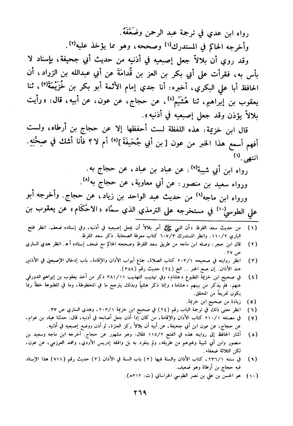 وَقد رُوِيَ أَن بِلَالًا جعل إصبعيه فِي أُذُنَيْهِ من حَدِيث أبي جُحَيْفَة بِإِسْنَاد لَا يأس بِهِ فَقرأت عَلَى أَبِي بَكْرِ بْنُ الْعِزِّ بْنِ قُدَامَةَ عَنْ أَبِي عَبْدِ اللَّهِ بْنِ الزَّرَّادِ أَن الْحَافِظ أَبَا عَليّ الْبكْرِيّ أَخْبَرَهُ أَنا جَدِّي إِمَامُ الأَئِمَّةِ أَبُو بكر بن خُزَيْمَة ثَنَا يَعْقُوبُ بْنُ إِبْرَاهِيمَ ثَنَا هُشَيْمٌ عَنْ حَجَّاجٍ عَنْ عَوْنٍ عَنْ أَبِيهِ قَالَ ((رَأَيْتُ بِلالا يُؤَذِّنُ وَقَدْ جَعَلَ إِصْبَعَيْهِ فِي أُذُنَيْهِ))