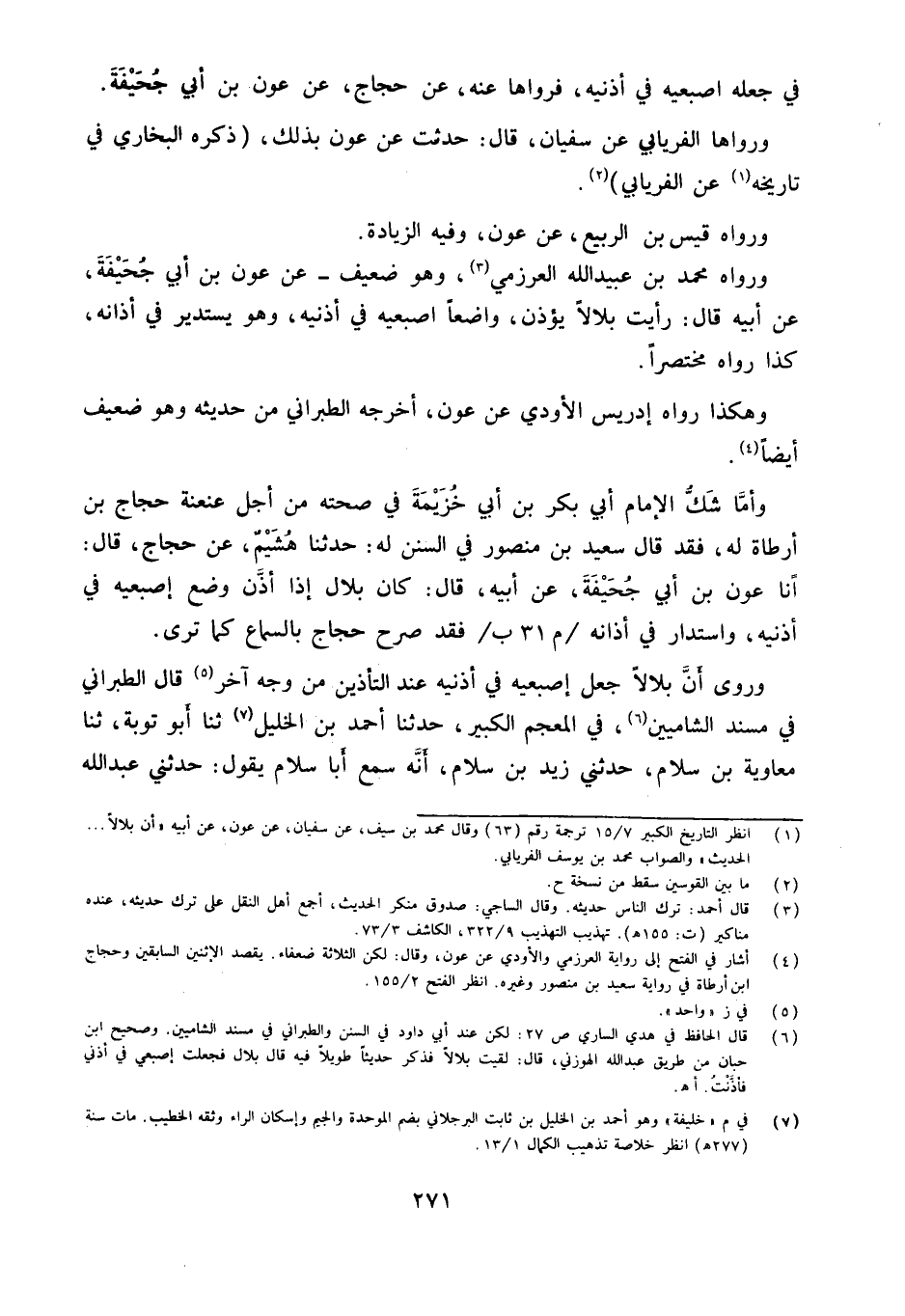 وَأما شكّ الإِمَام أبي بكر بن أبي خُزَيْمَة فِي صِحَّته من أجل عنعنة حجاج بن أَرْطَأَة لَهُ فقد قَالَ سعيد بن مَنْصُور فِي السّنَن لَهُ حَدَّثنا هُشَيْمٌ عَنْ حَجَّاجٍ قَالَ أَنا عَوْنُ بْنُ أَبِي جُحَيْفَةَ عَنْ أَبِيهِ قَالَ كَانَ بِلالا إِذَا أَذَّنَ وَضَعَ إِصْبَعَيْهِ فِي أُذُنَيْهِ وَاسْتَدَارَ فِي أَذَانِهِ م 31 ب فَقَدْ صَرَّحَ حَجَّاجٌ بِالسَّمَاعِ كَمَا تَرَى