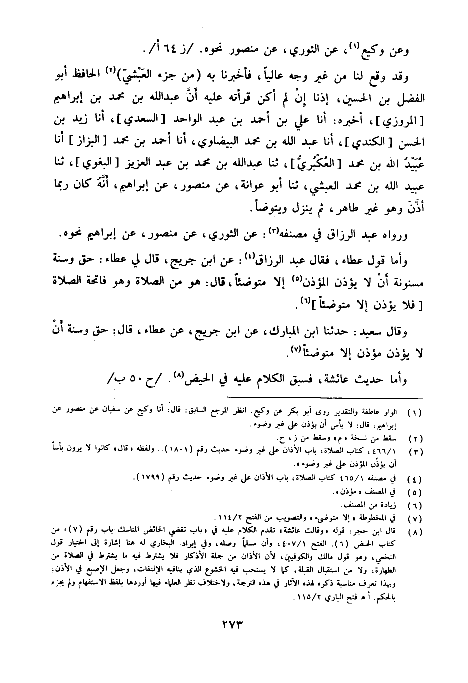 وَقد وَقع لنا من غير وَجه عَالِيا فأَخْبَرَنَا بِهِ (من جُزْء العبشي) الْحَافِظ أَبُو الْفضل بن الْحُسَيْن إِذْنا إِن لم أكن قرأته عَلَيْهِ أَن عبد اللَّهِ بْنُ مُحَمَّدِ بْنِ إِبْرَاهِيمَ [الْمروزِي] أخبرهُ أَنا عَليّ بن أَحْمد بن عبد الْوَاحِد [السَّعْدِيّ] أَنا زيد بن الْحسن [الْكِنْدِيّ] أَنا عَبْدُ اللَّهِ بْنُ مُحَمَّدٍ الْبَيْضَاوِيّ أَنا أَحْمد بن مُحَمَّد [الْبَزَّاز] أَنا عبيد الله بن مُحَمَّد [الكعبري] ثَنَا عُبَيْدُ اللَّهِ بْنُ مُحَمَّدِ بن عبد الْعَزِيز [الْبَغَوِيّ] ثَنَا عبيد الله بن مُحَمَّد العبشي ثَنَا أَبُو عوَانَة عَن مَنْصُور عَن إِبْرَاهِيم أَنه كَانَ رُبمَا أذن وَهُوَ غير طَاهِر ثمَّ ينزل وَيتَوَضَّأ